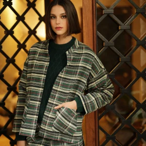 Blazer Diana. Estampado geométrico con detalles en color oro. Con cuello solapa . Manga larga. Cierre con botones. Disponible en tono verde o fresa. Llevala con el pantalón a juego para tener un look más formal.