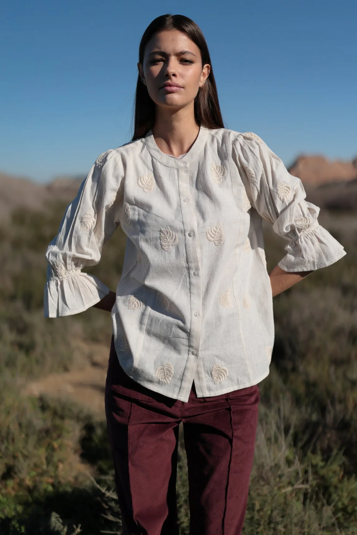 Su corte relajado con botones al frente y mangas ligeramente abullonadas con detalle fruncido en los puños aporta un aire femenino y sofisticado sin perder comodidad. Ideal para combinar con pantalones de pinzas, mezclilla o faldas fluidas, es la blusa perfecta para quienes buscan estilo, frescura y un toque artesanal en su guardarropa.