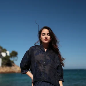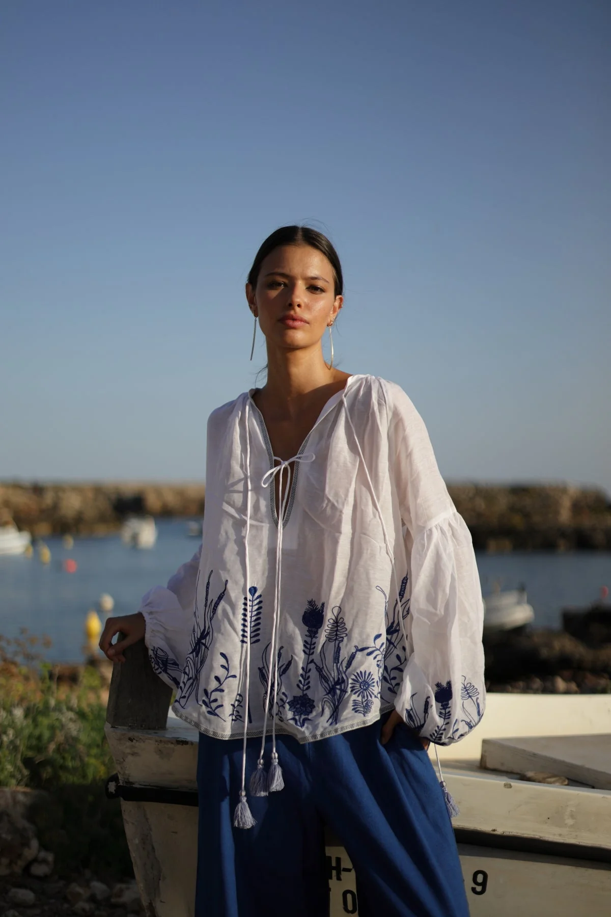 Blusón Carmen de auténtico espíritu bohemio. Confeccionado en un delicado color blanco que resalta la frescura de la temporada. Los bordados a contraste en color azul ponen de relieve el trabajo artesanal añadiendo un toque único y lleno de detalles. De corte amplio y cómodo el blusón presenta un cuello redondo con cintas acabadas en pompón ideales para anudar y ajustar dándole un toque coqueto. Las mangas holgadas con un ligero frunce en los puños complementan su diseño relajado y femenino. ¡Super estiloso! ¡El blusón Carmen es perfecto para combinar con el pantalón Claudia de la misma colección creando un look boho chic impecable y lleno de personalidad!