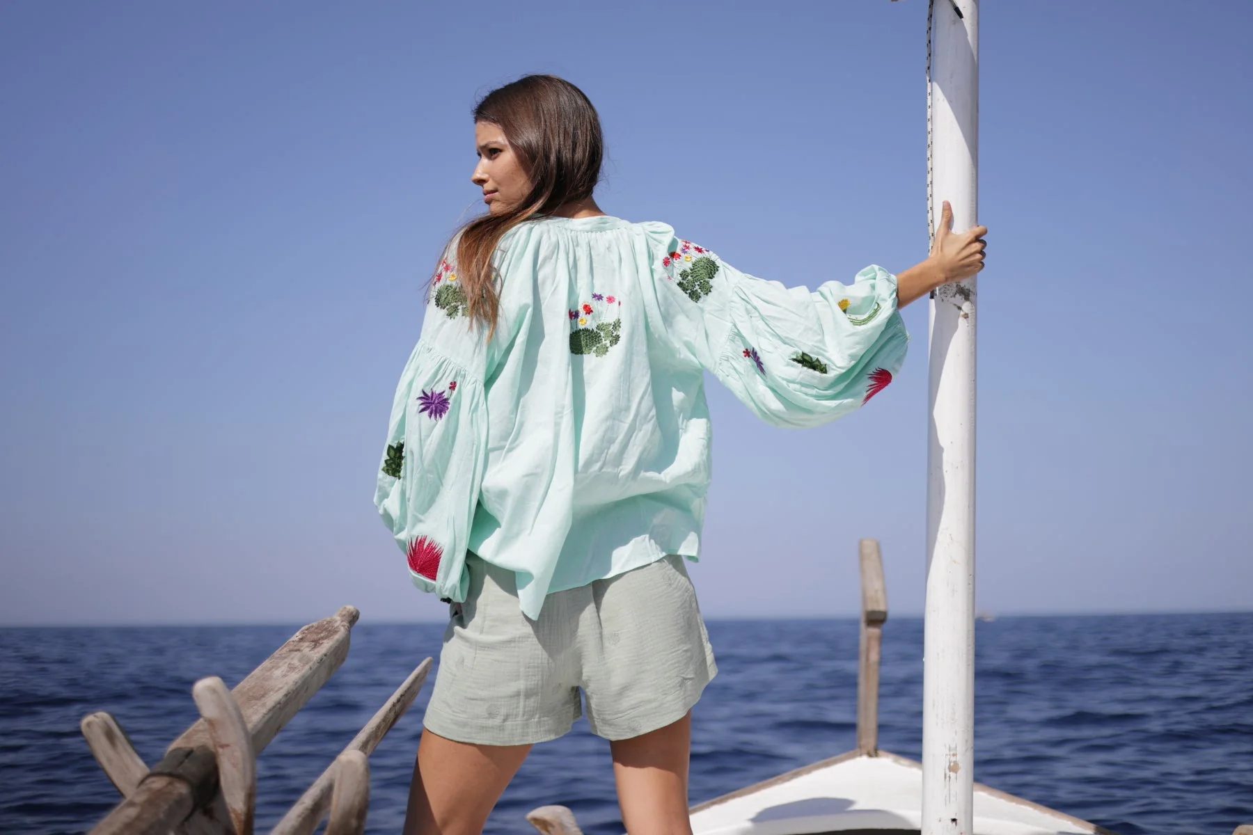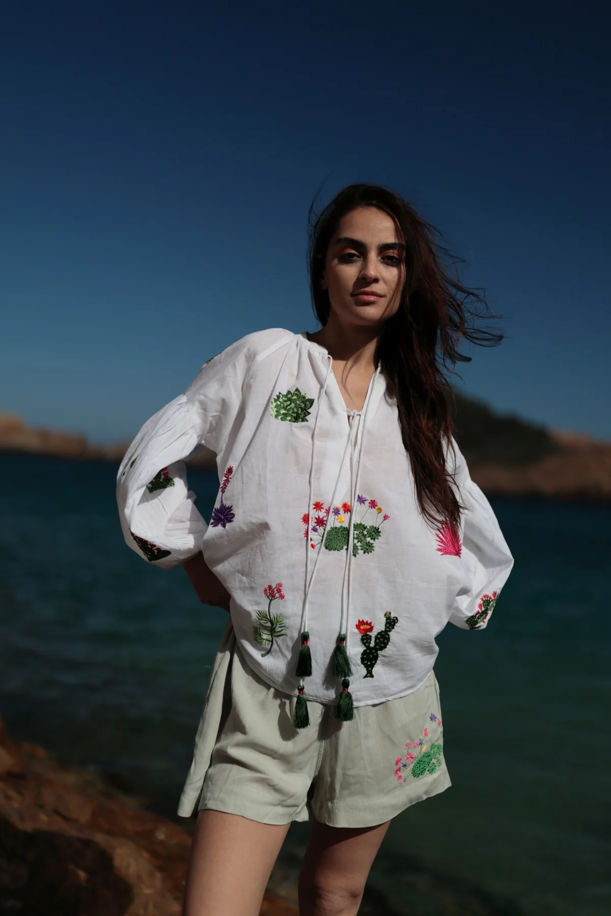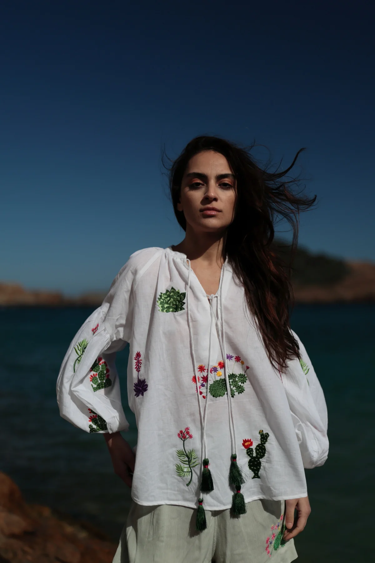 El blusón Vittoria es de inspiración bohemia. Confeccionado en suave algodón colores aqua y blanco destaca por sus llamativos bordados de cactus. Su cuello redondo tiene unas cintas a tono para que puedas anudarlo., acabadas en pompon artesanal. Con favorecedor escote en V. Sus mangas largas y holgadas terminadas en puño elástico, aportan comodidad y movimiento. Con caída fluida . Con el blusón Vittoria conseguirás un look sofisticado y bohemio !