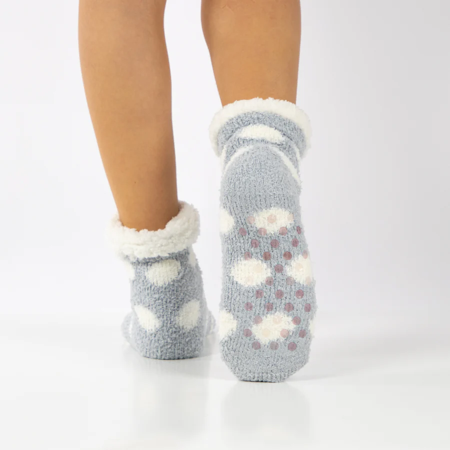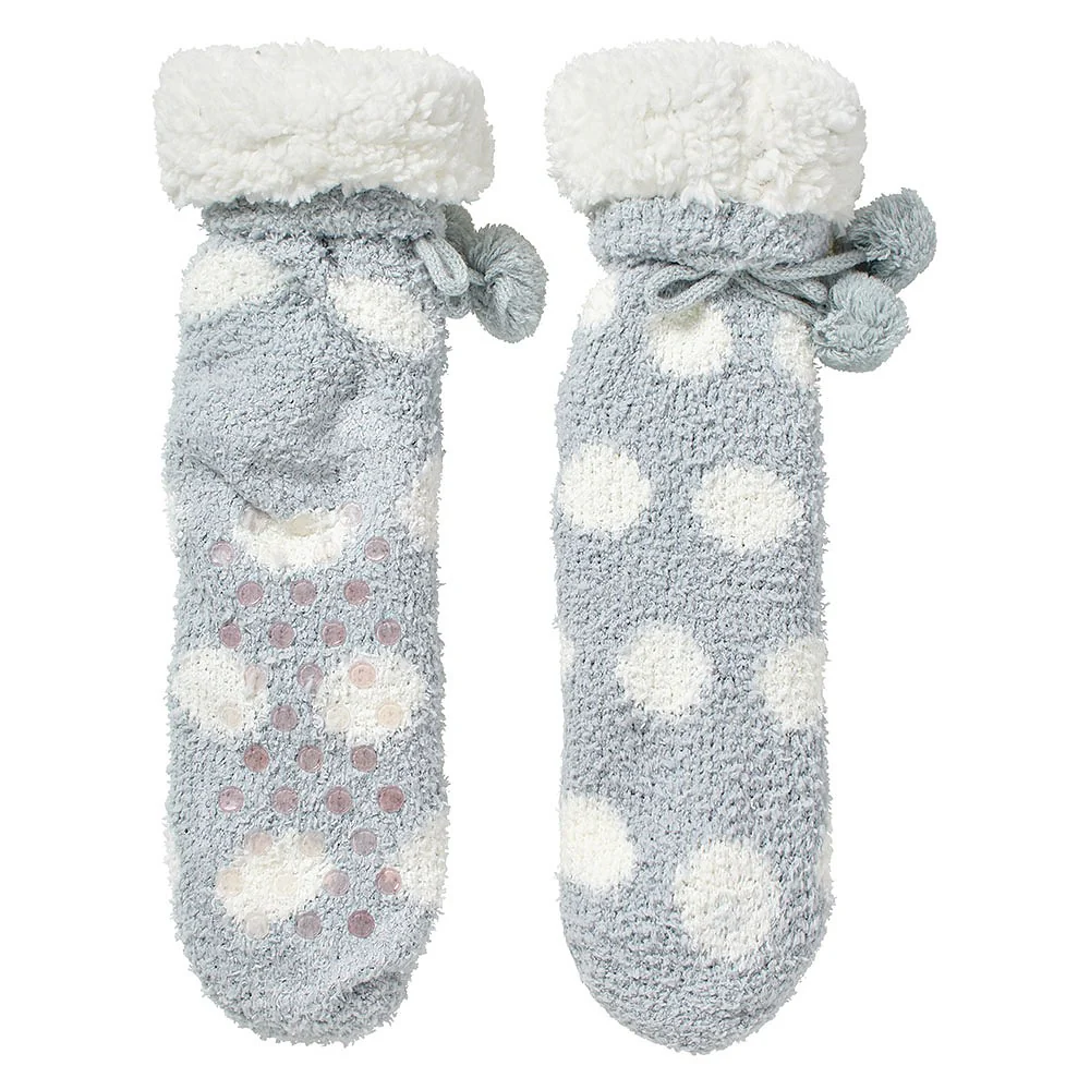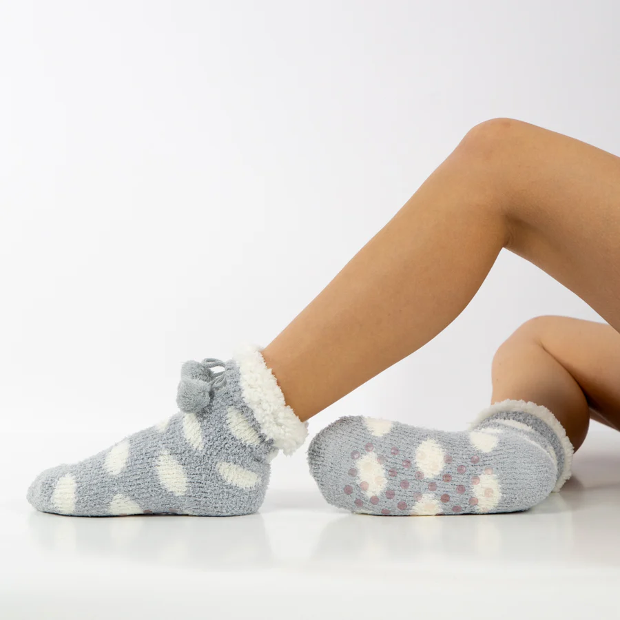 Estos alegres calcetines para casa tienen un diseño de lunares coloridos y divertidos pompones.