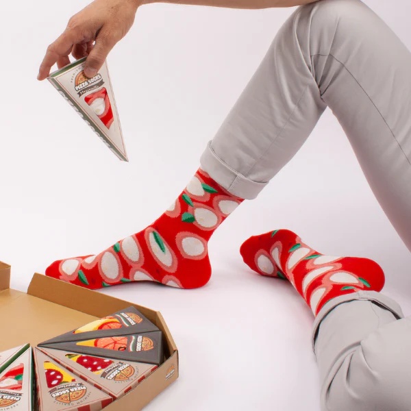 Caja con 1 par de calcetines para los amantes de la pizza.