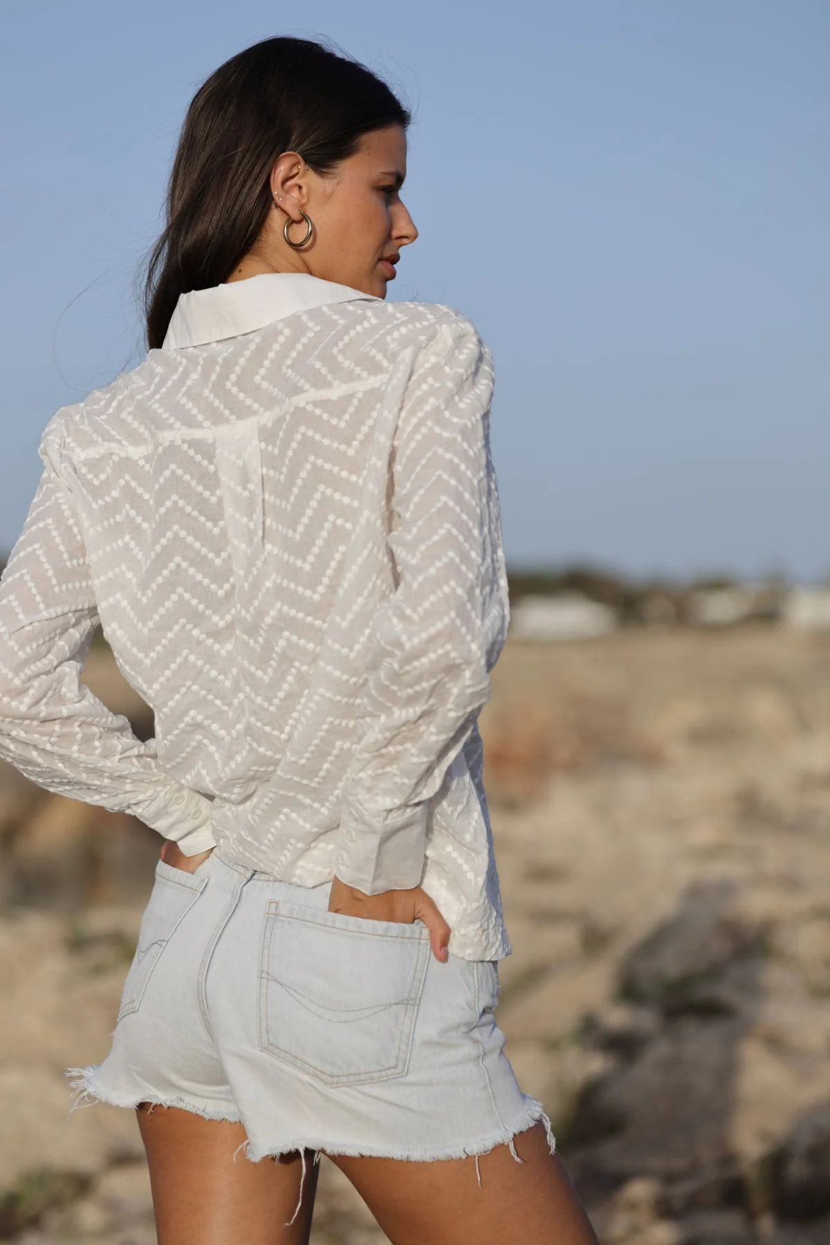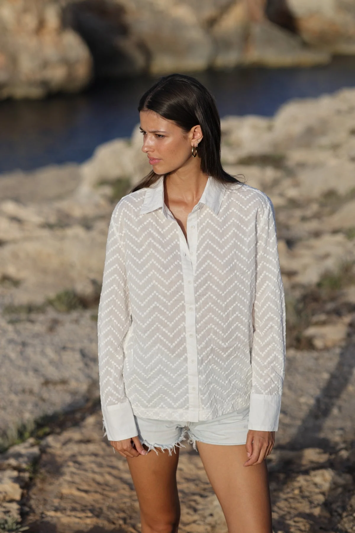 La camisa blanca bordada es una prenda imprescindible para un look fresco y atemporal con un toque romántico y artesanal. Confeccionada en 100% algodón, su tejido natural y transpirable la hace ideal para los días cálidos. Su diseño destaca por los sutiles puntitos bordados en relieve, que le aportan una textura delicada y un encanto visual discreto pero lleno de personalidad.