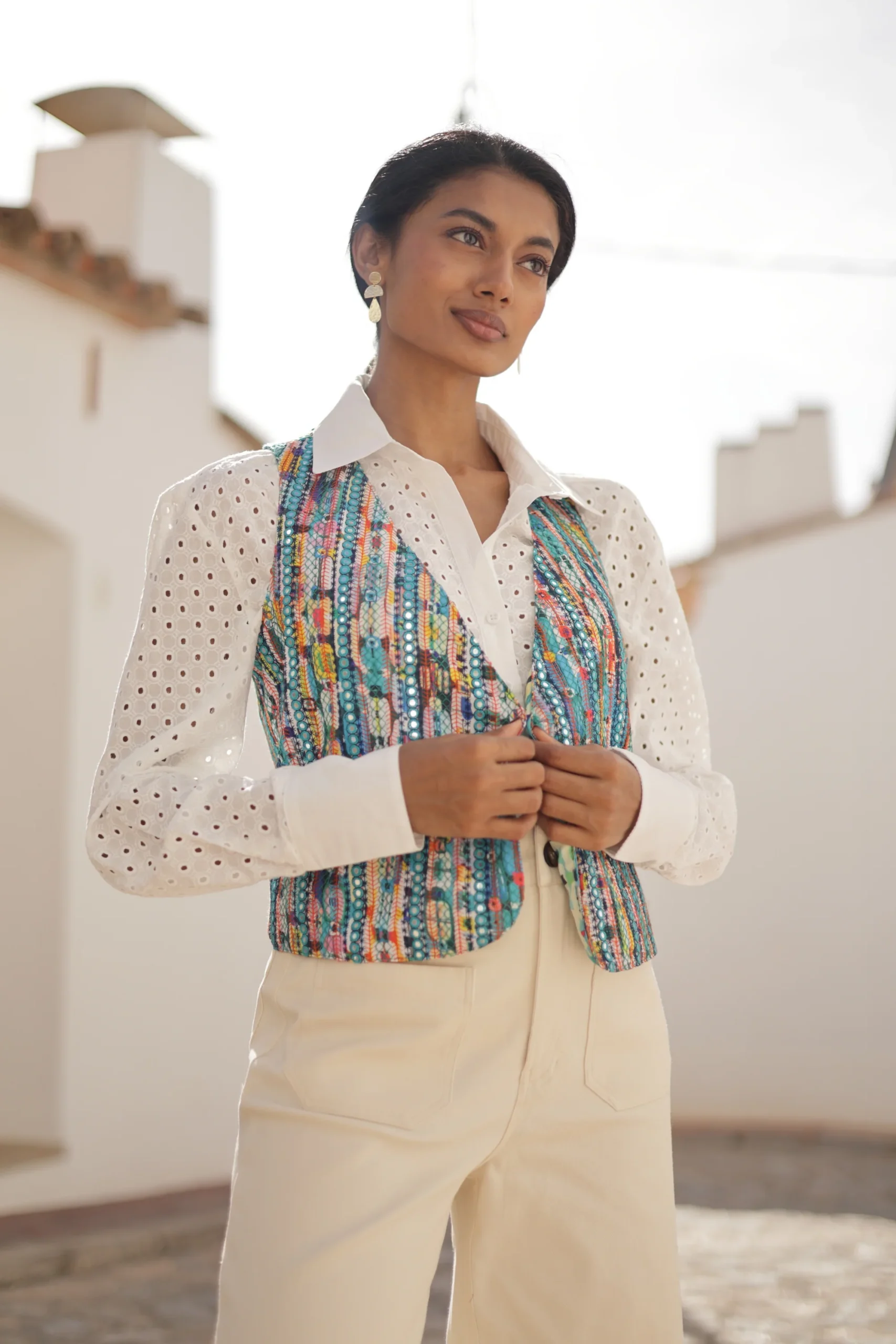 El chaleco Ceilán encarna el espíritu hippie con un toque de estilo y frescura. Estampado geométrico en tonos azules y bordado artesanal de espejitos. Es una prenda versátil que se puede combinar con diferentes looks. El chaleco Ceilán es una opción encantadora para añadir un toque bohemio y artesanal a tu look!