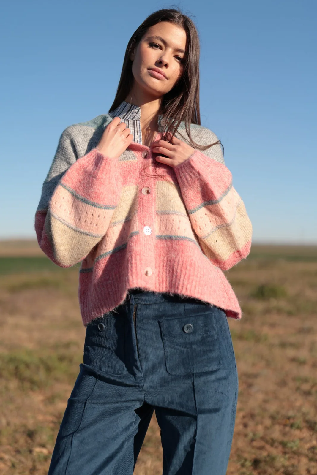 Añade suavidad y color a tu armario con nuestra chaqueta de punto Aura, una prenda de corte relajado y tejido esponjoso que mezcla tonos rosados, crema y gris con sutiles líneas azuladas. Esta chaqueta de inspiración retro es perfecta para darle un toque acogedor y femenino a tus looks de temporada.