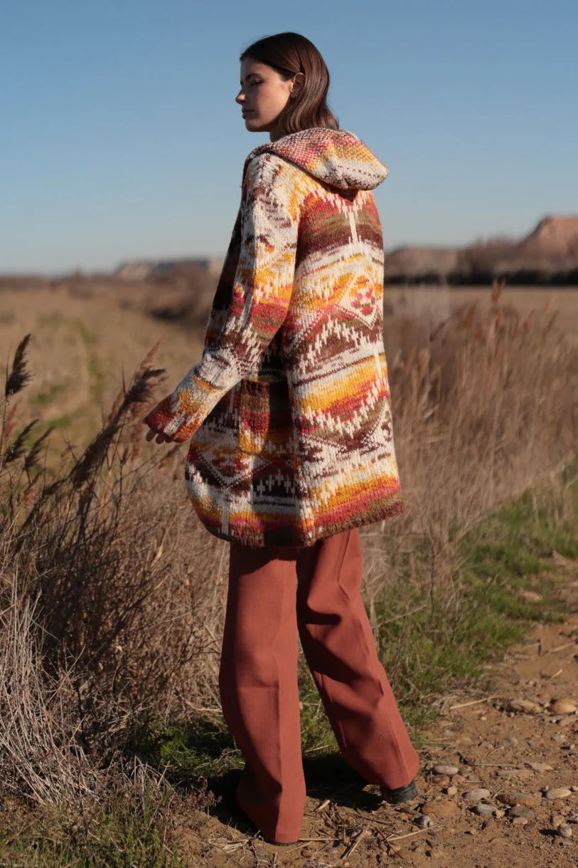 Confeccionada en un tejido suave y cálido, presenta un diseño jacquard de inspiración étnica con una paleta de colores envolventes. Disponible en azul, naranja y rosa. Perfecta para aventuras al aire libre, escapadas de otoño o simplemente para envolver tu día a día con una vibra boho y contemporánea.