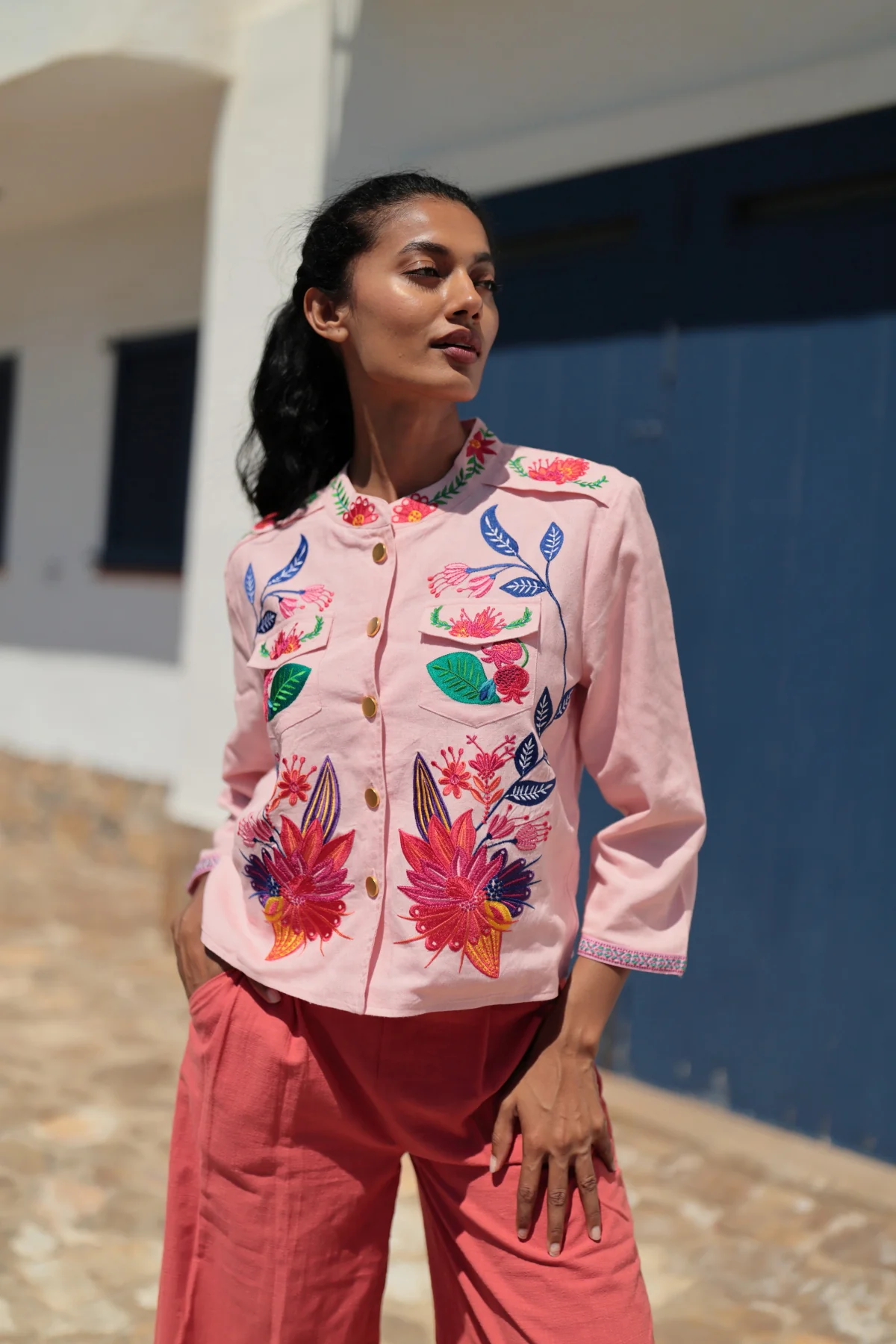 Chaqueta de verano, de espíritu boho romántica en color rosa. Muy femenina. Pertenece a la colección Itza. Destaca por sus impresionantes bordados a contraste, elaborados artesanalmente. Sus bordados le dan un aire bohemio y sofisticado. Con mangas 3/4, cierre frontal con botones metálicos y cuello tunecino que le aporta originalidad. Con dos bolsillos en la parte de delante. Detalle de ribete en mangas. Detalle de cuidado forro estampado en interior que le da un toque original y divertido. Se recomienda una talla superior a la habitual. ¡La chaqueta Marcella es super estilosa y llena de personalidad!