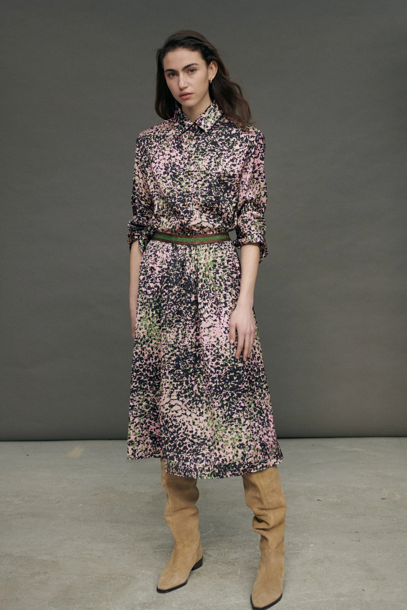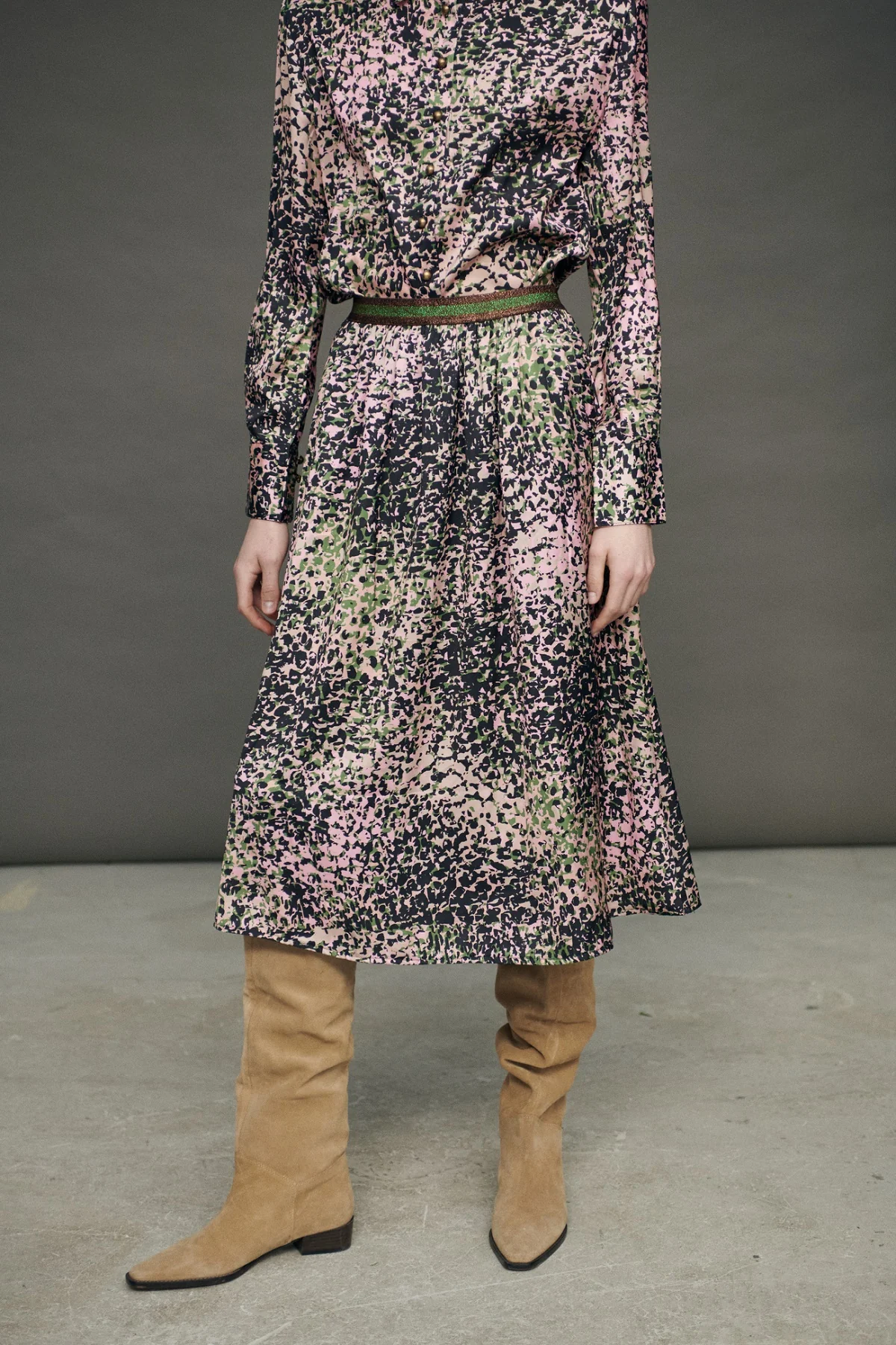 Falda midi Mariela NF17 de corte fluido y goma en la cintura. Estampado original en tonos verdes y rosas, ideal para añadir color a tu outfit. Versátil y cómodo para llevarlo en cualquier ocasión.