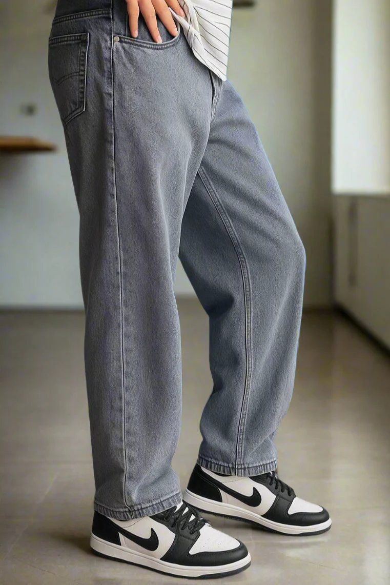 Inspirados en el hip-hop noventero y la moda skater, estos pantalones de mezclilla ofrecen un corte holgado y recto que refleja libertad y estilo urbano. Su tono gris elegante, conocido como Graphite Mist, aporta un aire sofisticado que los hace ideales tanto para looks casuales como para outfits más arriesgados.