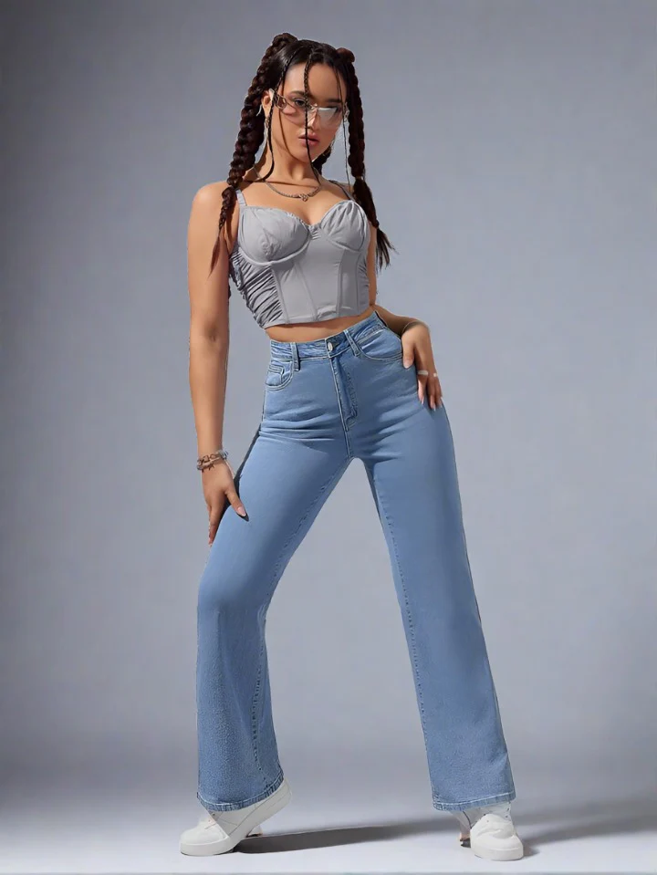 Estos jeans no solo ofrecen un ajuste perfecto para la mujer moderna, sino que también reflejan un espíritu juvenil y dinámico. Diseñados para ser tanto elegantes como funcionales, estos pantalones acampanados son ideales para cualquier ocasión, desde una reunión informal hasta un evento social.