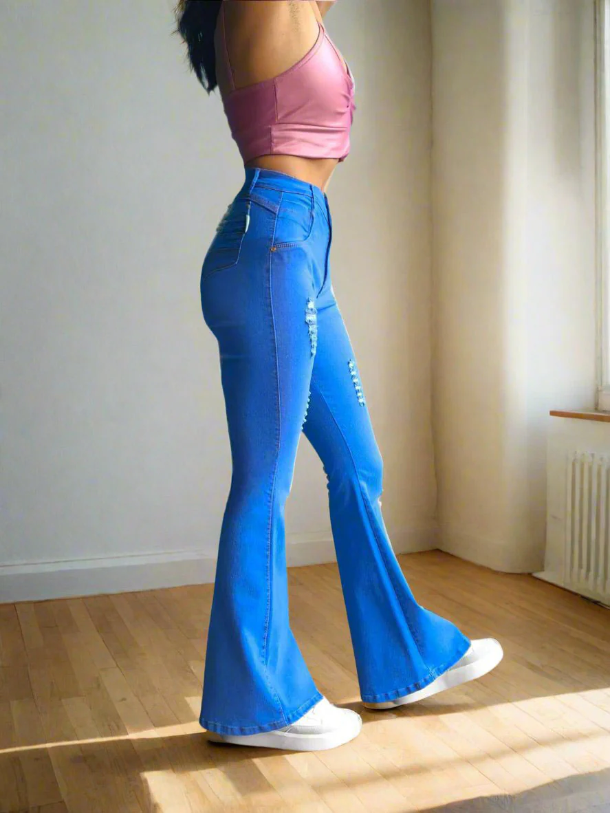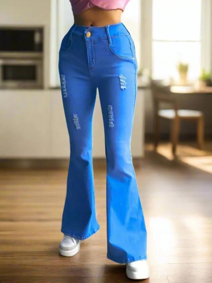 Descubre el encanto de nuestros pantalones de mezclilla para mujer en color azul con diseño de campana y rotos. Estos flare jeans con levantamiento de glúteos están creados para resaltar tus curvas y brindar ese toque de confianza que necesitas en cada paso. Con su efecto lifting, tus pompis lucirán impresionantes en cualquier ocasión, combinando estilo y funcionalidad.