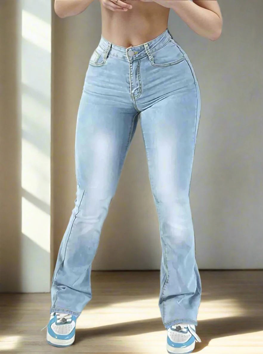 Nuestros vaqueros flare en azul cielo son la elección ideal para quienes buscan destacar. Con un diseño rasgado y trendy, estos jeans son perfectos para combinar con cualquier prenda y accesorio, elevando tu estilo personal.