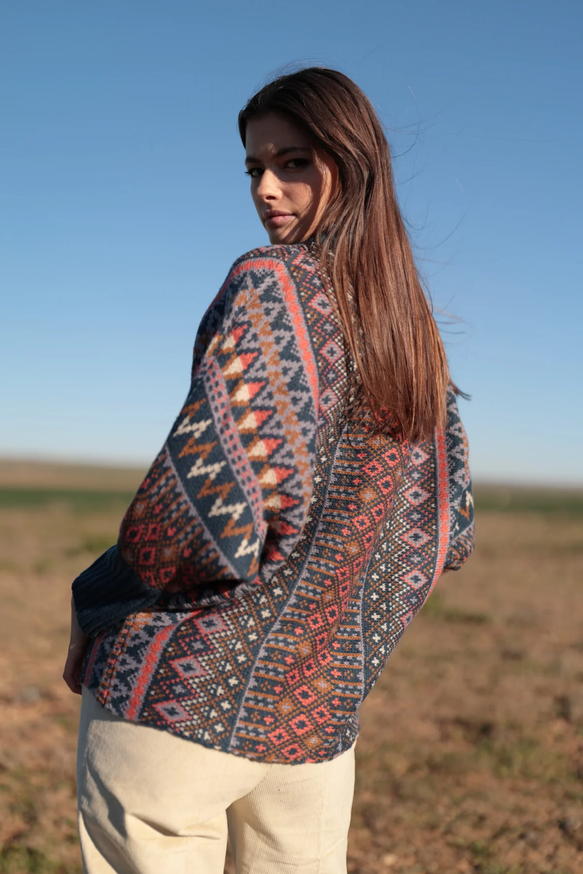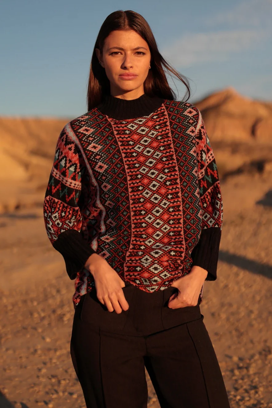 Diseñado para envolverte con calidez sin perder estilo, este jersey presenta un corte relajado y puños de canalé marcados que añaden estructura. Es ideal para días fríos y para quienes buscan una estética étnica contemporánea con alma artesanal.