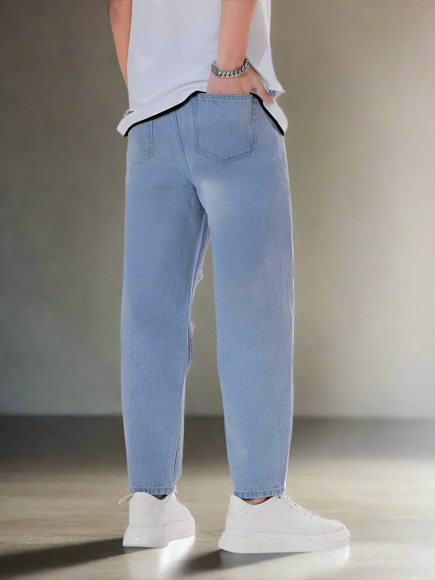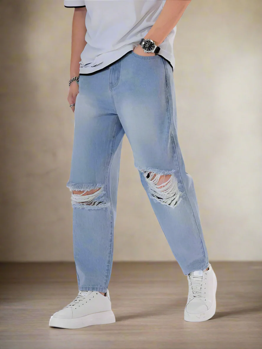 Descubre los Mom Jeans Azules Cielo Rotos, diseñados por expertos americanos y perfectos para el hombre mexicano moderno. Estos jeans combinan un estilo atrevido y roto con la comodidad legendaria que buscas en tu día a día.