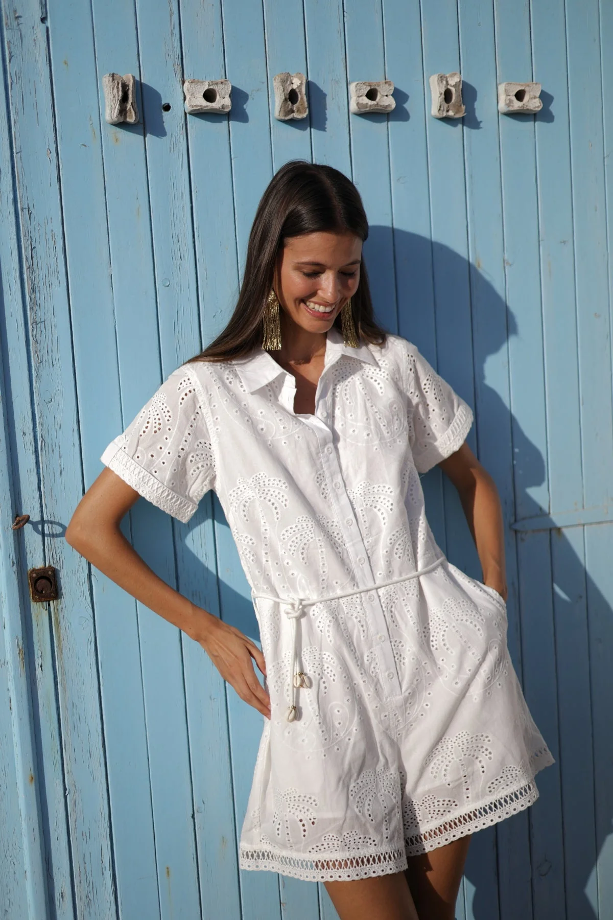 El mono corto Beatriz es fantástico para el verano ! En algodón color blanco destaca por sus delicados bordados calados. Tiene cuello camisero, manga corta, apertura frontal con botones. La parte inferior del short lleva una delicada pasamanería. En cintura puedes anudarlo con cintas a tono. El mono Beatriz es super fresco y estiloso y te dará un toque super chic a tu outfit!