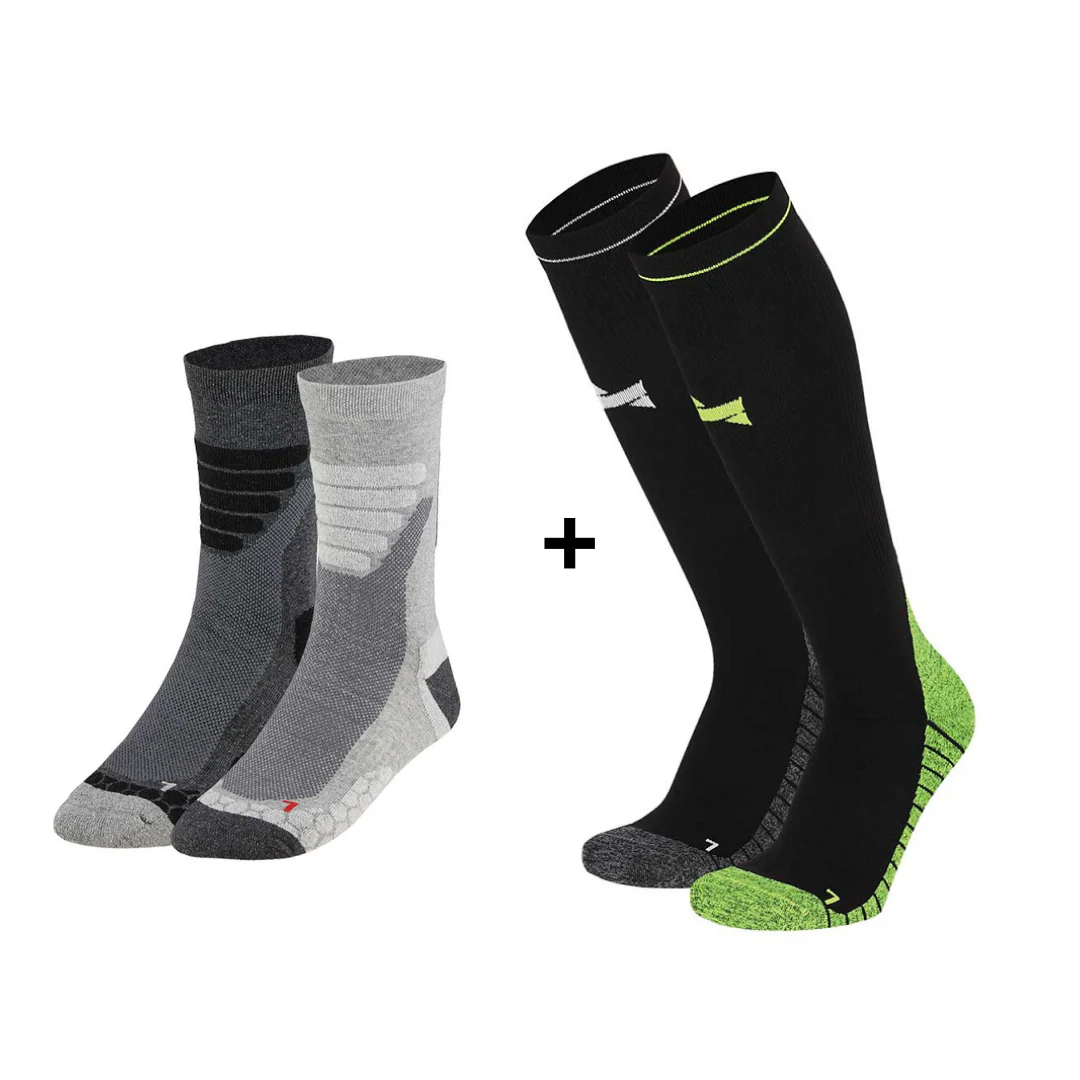 Aprovecha este Pack Oferta de 2 pares de calcetines técnicos de senderismo y 2 pares de calcetines de compresión gradual deportiva.