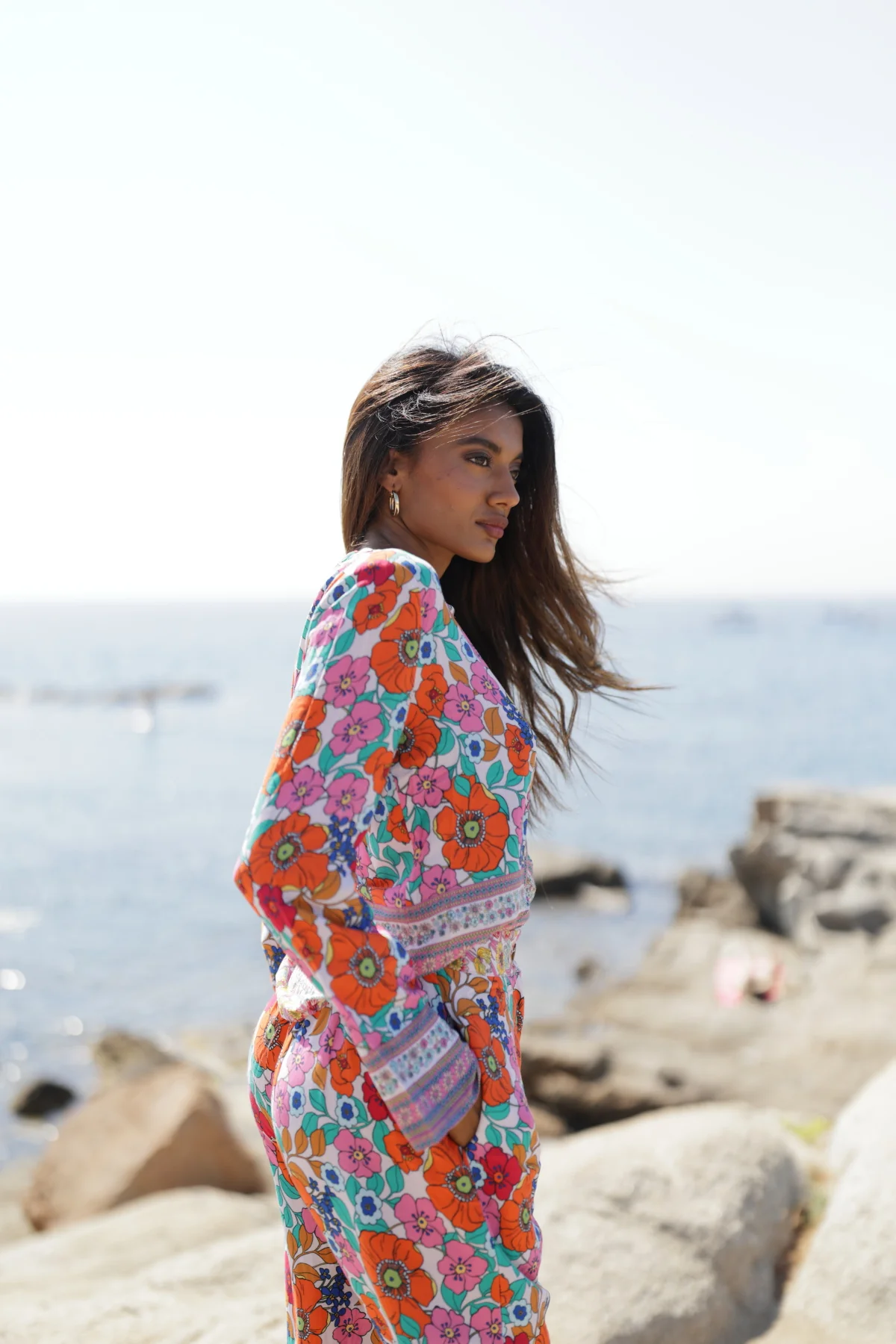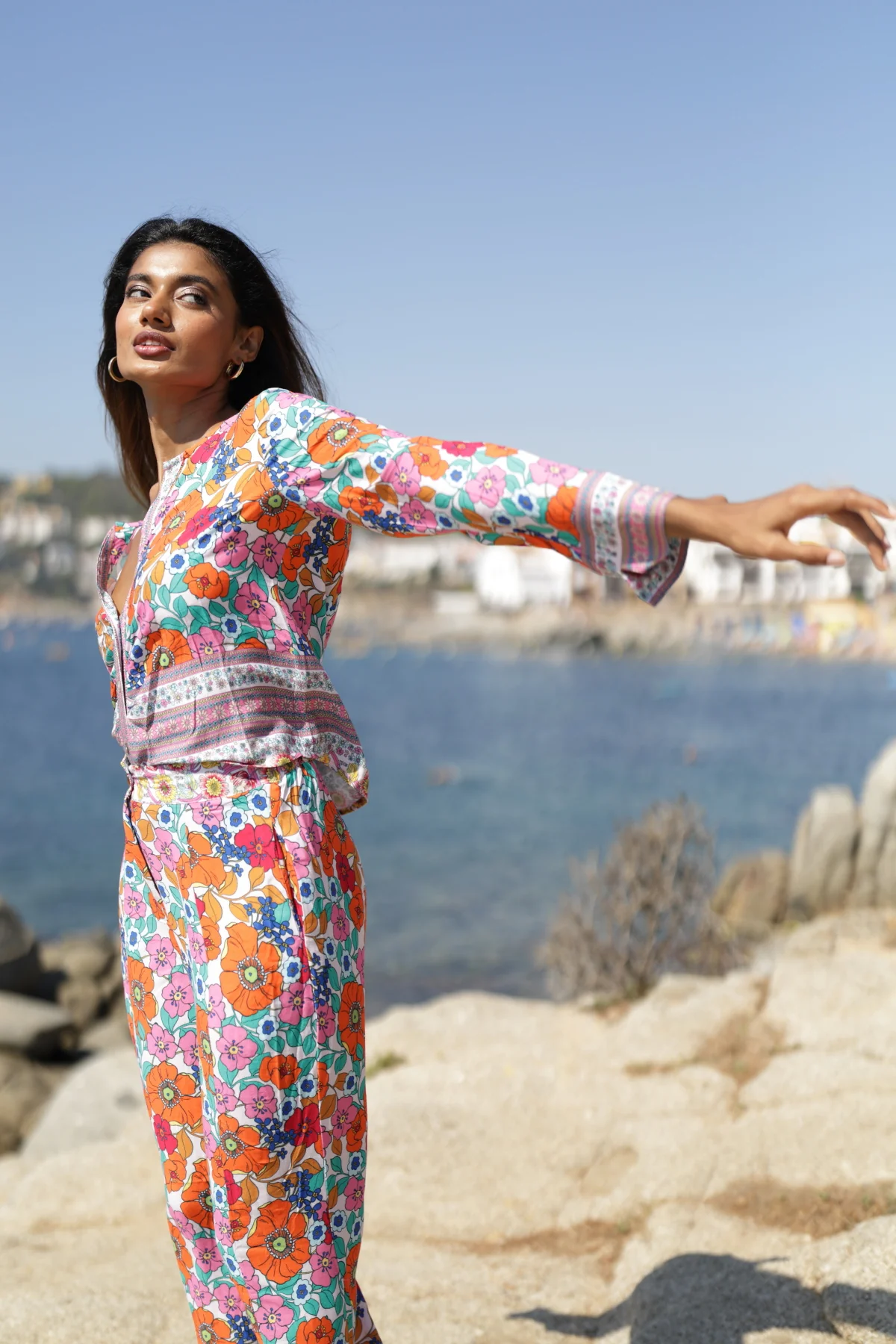 Pantalón Chiara. Estampado Capri, multi floral en tonos tierra anaranjado. Caída Fluida. Cierre frontal con cremallera y botón. Apertura en los laterales de la parte inferior. Sigue tu talla habitual. Combínalo con la blusa Eleonora del mismo estampado y lucirás un total look Luna Llena!