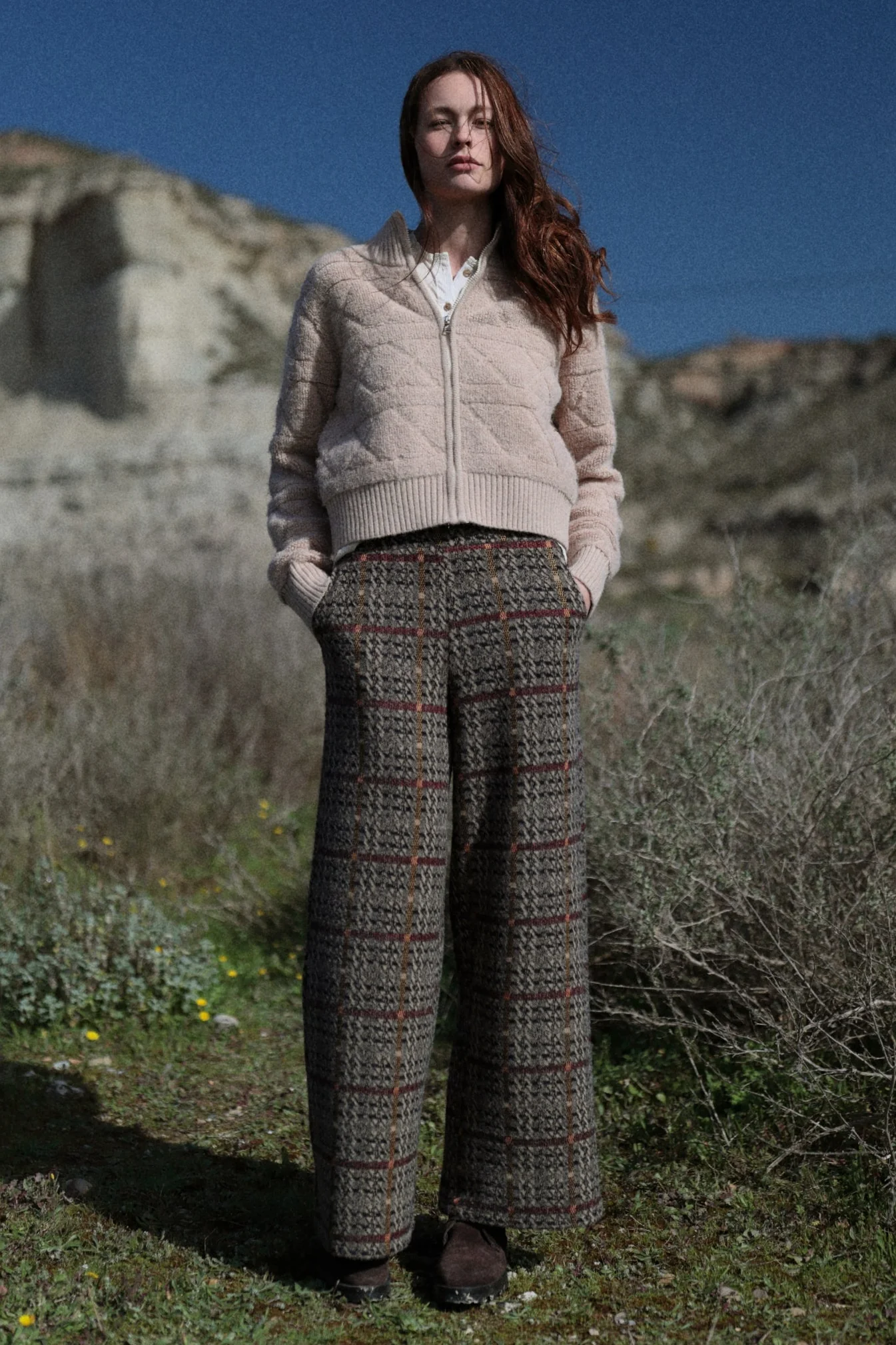 Pantalón Emma . Con agradable tejido. Su cintura elástica te garantiza un ajuste cómodo y flexible. Sus bolsillos le dan un toque estiloso. La pernera ancha y fluida te proporciona un look elegante y fluido. Disponible en tweed en gris! Nosotros lo hemos combinado con la chaqueta Amila para un total look Luna Llena.