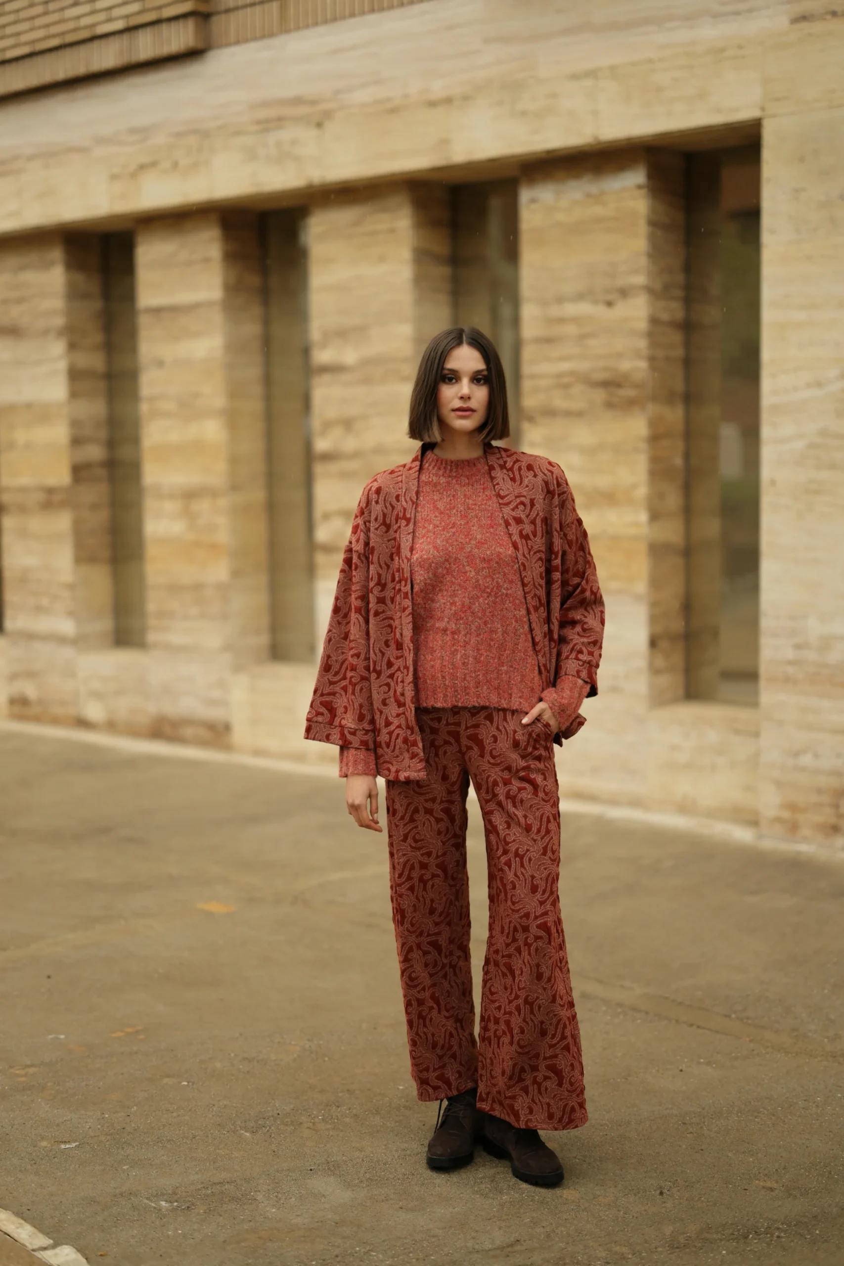 Pantalón Emma, perteneciente a la colección Tanger. Su delicado estampado evoca las antiguas tapicerias artesanales. Disponible en tonos tierra o negro. Su cintura elástica garantiza un ajuste cómodo y flexible. Sus bolsillos le dan un toque estiloso. La pernera ancha y fluida te permite un look elegante. Queda ideal combinado con el kimono de la misma colección !