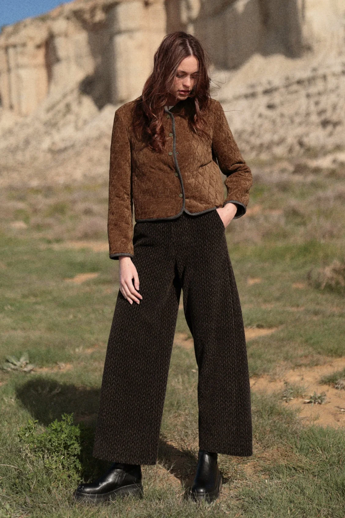 Pantalón Emma. Con agradable tejido. Su cintura elástica te garantiza un ajuste cómodo y flexible. Sus bolsillos le dan un toque estiloso. La pernera ancha y fluida te proporciona un look elegante y fluido. Disponible en tono gris. Nosotros lo hemos combinado con la chaqueta Sierra para un total look Luna Llena.