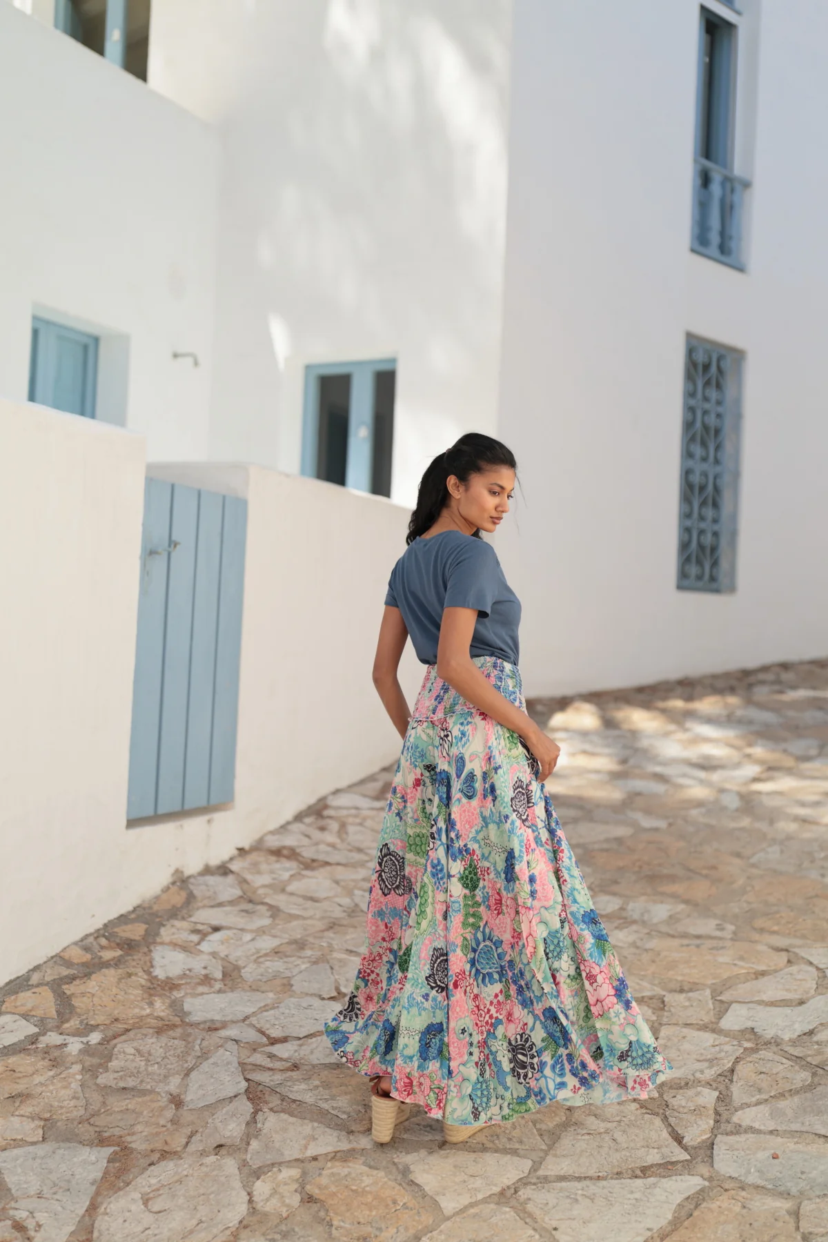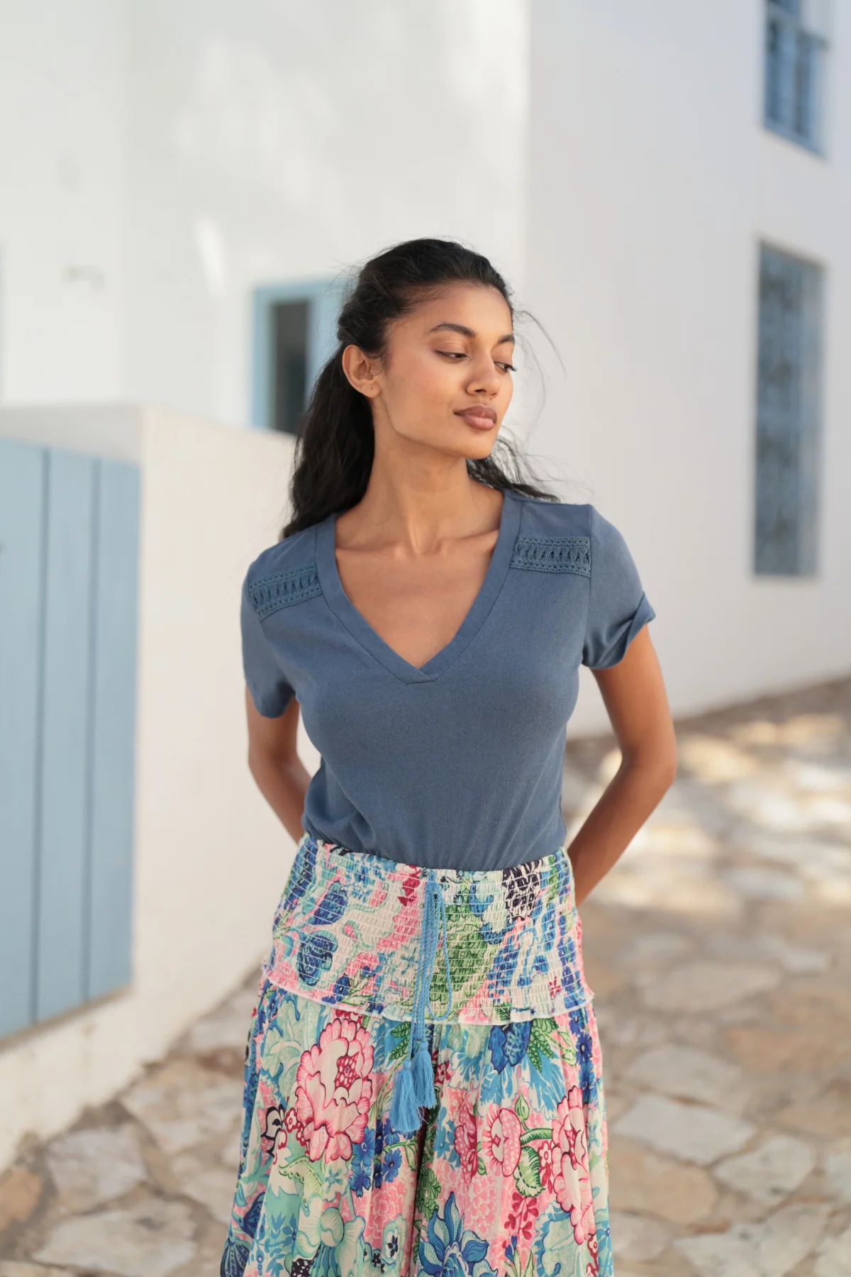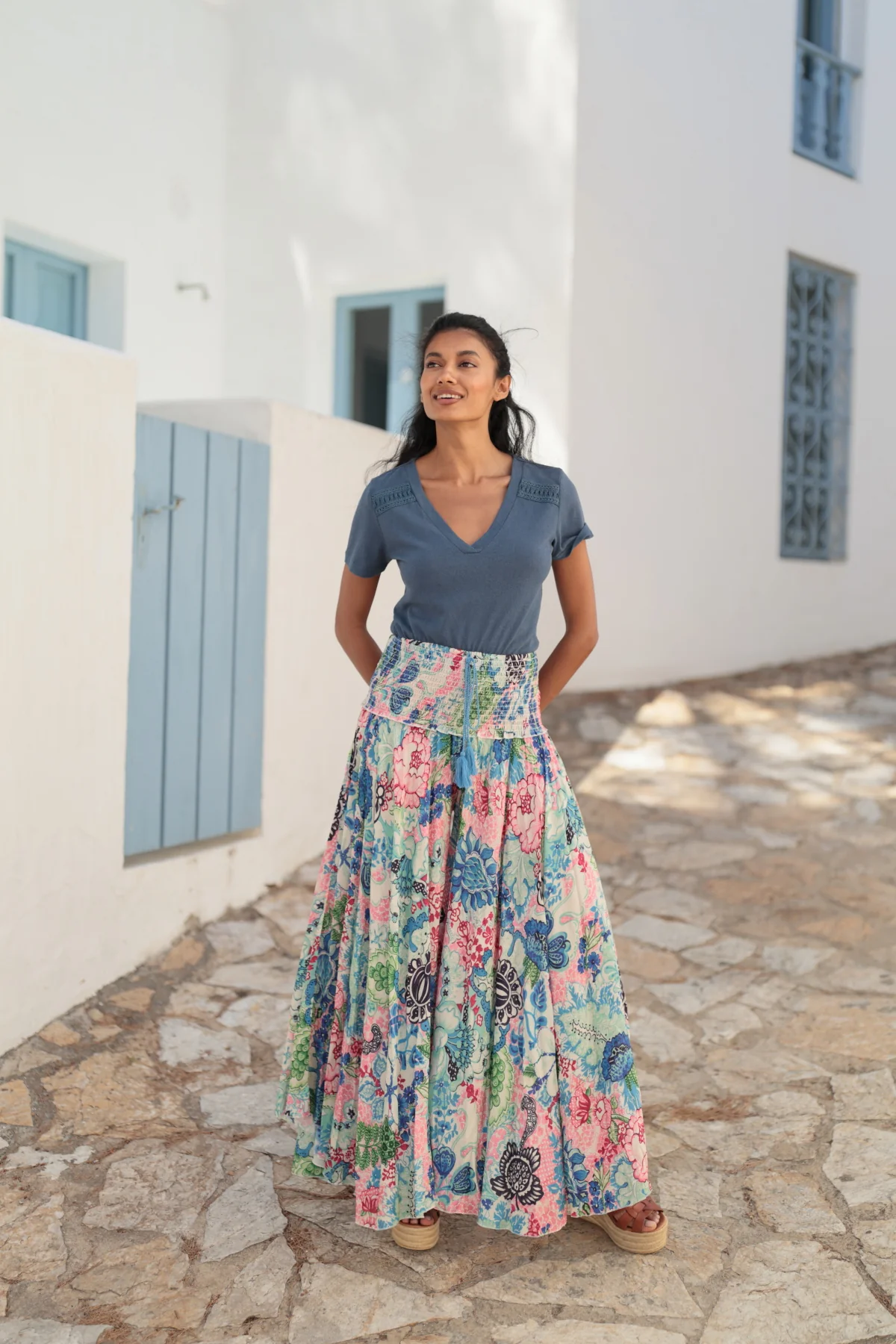 El pantalón Margaret captura el espíritu libre y bohemio de la mujer contemporánea. Su tejido ligero y suave, y su diseño de talle alto y cintura elástica fruncida ofrece comodidad sin renunciar al estilo. Detalle de cintas a contraste acabadas en pompón artesanal. Destaca por su estampado vibrante y floral, convirtiéndolo en una prenda versátil para cualquier ocasión. Su pernera amplia y fluida añade movimiento . Combínalo con la camisa Alba para un total look LUNA LLENA!.