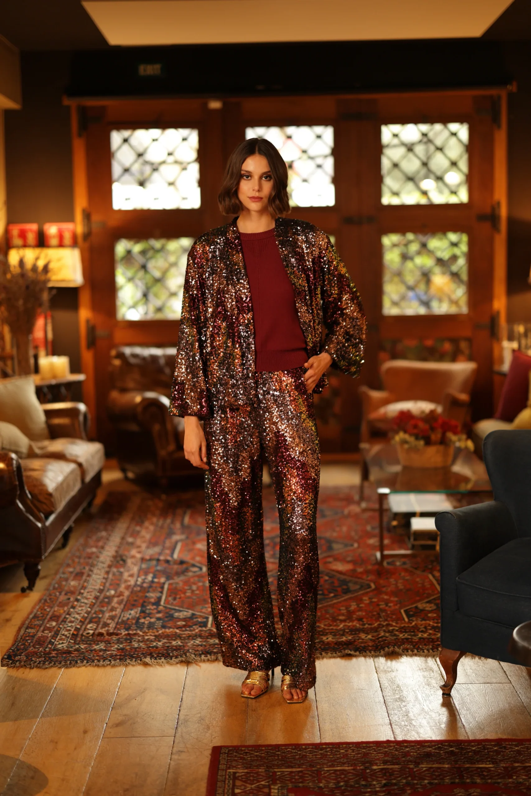 El pantalón Mademoiselle de lentejuelas bordadas es una prenda elegante. De corte largo. Pernera ancha. Fluido. Sin ajustar. Atemporal. Es un fondo de armario ideal!. Combínalo con un jersey de punto para un look más informal. O llévalo con el kimono Adriana y conseguirás un look glamouroso y cómodo.!