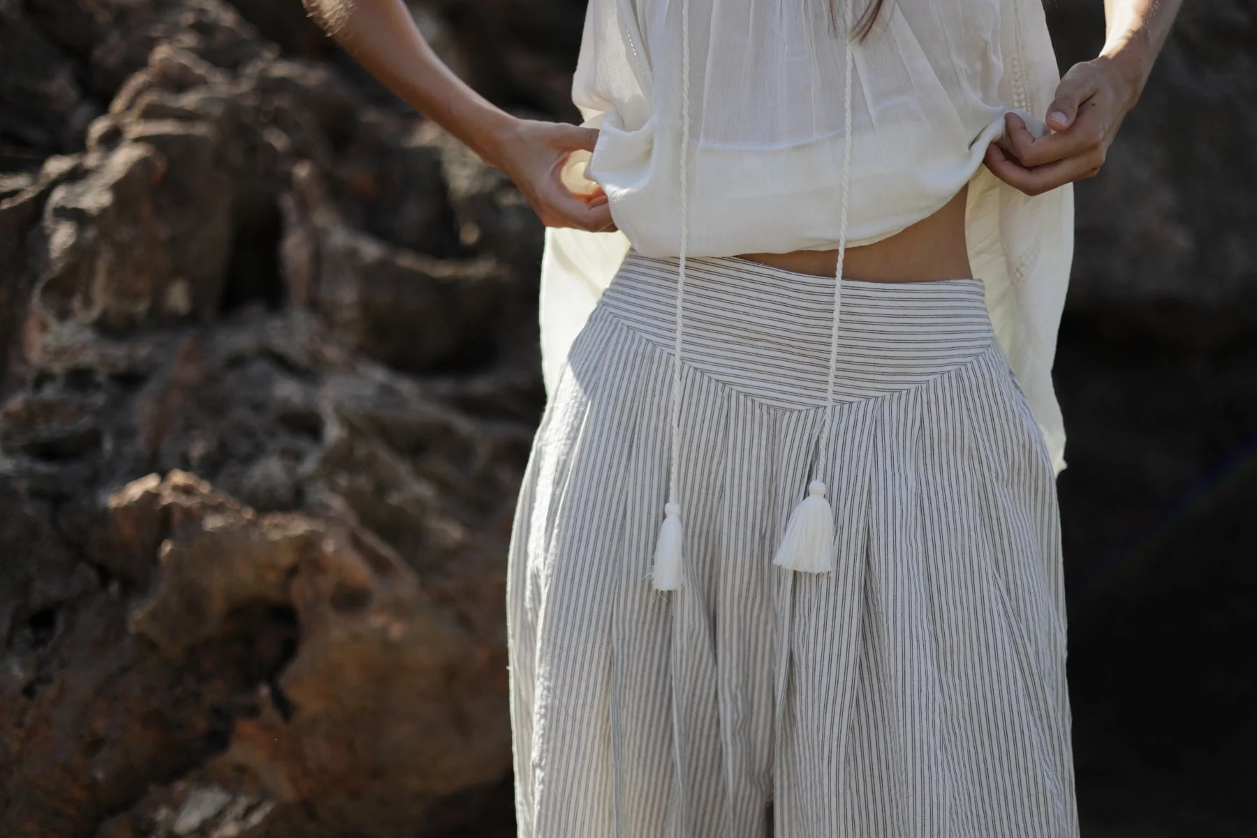 El pantalón Marilyn presenta un diseño de finas rayitas combinadas en color natural y negro. Muy discretas que fluyen suavemente. En la parte superior crea un efecto fajin que realza tu figura ofreciendo una silueta favorecedora. Es perfecto para los dias cálidos. Confeccionado en ligero algodón ofrece comodidad y estilo. El cierre con cremallera es perfecto para poderlo ajustar y su corte fluido con pinzas y pernera ancha le añade un toque de sofisticación y frescura a tu outfit veraniego. !