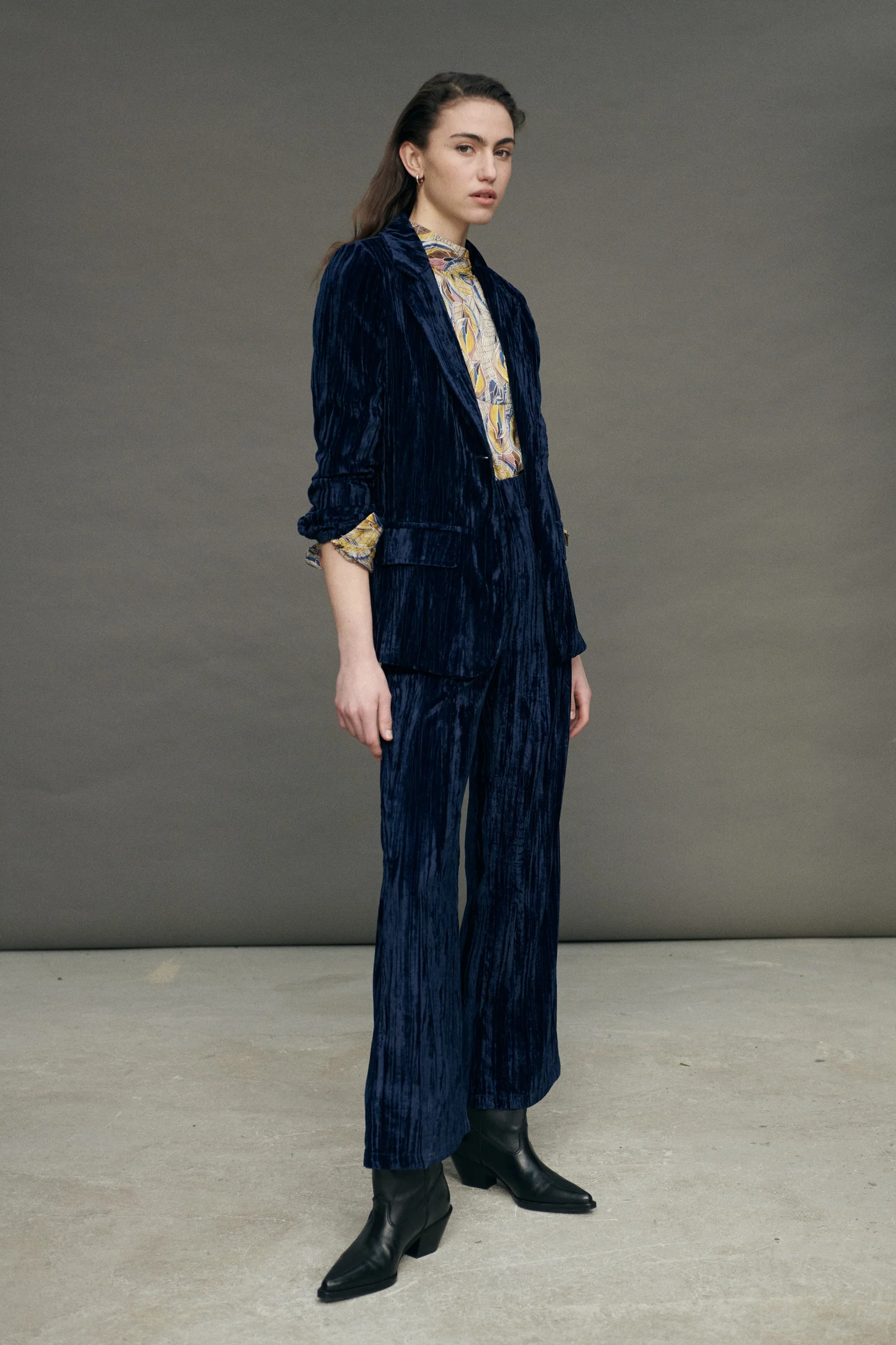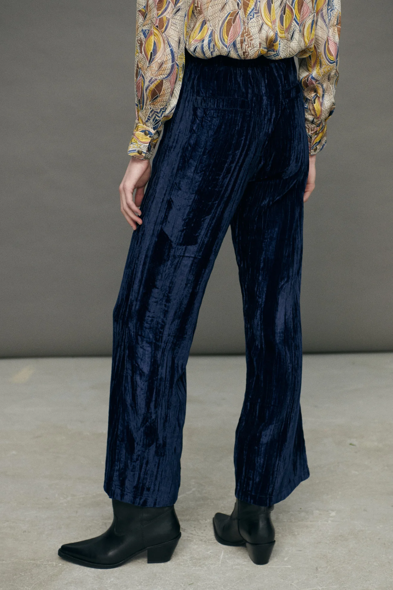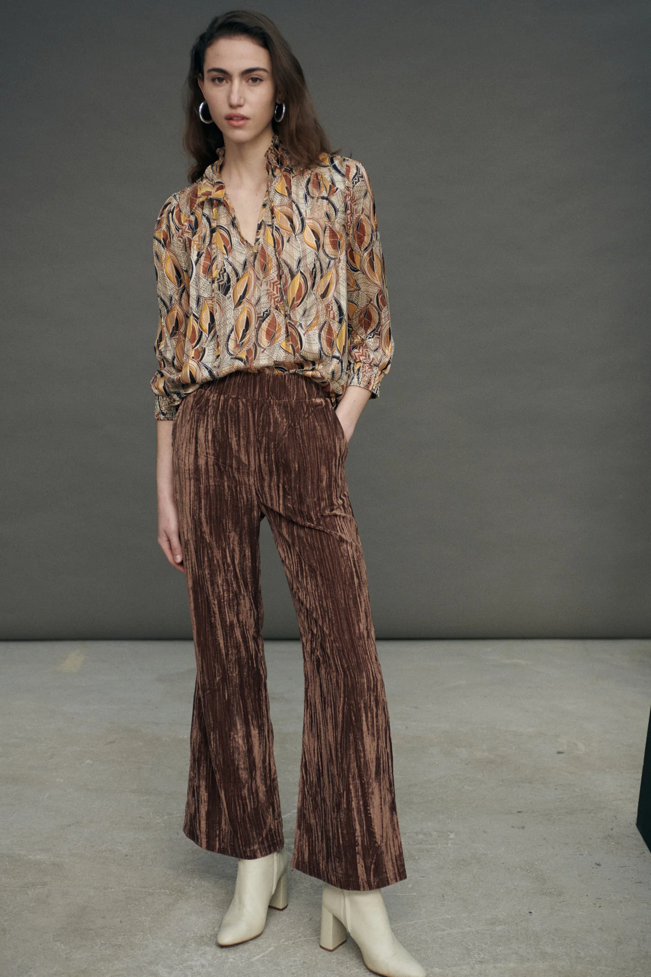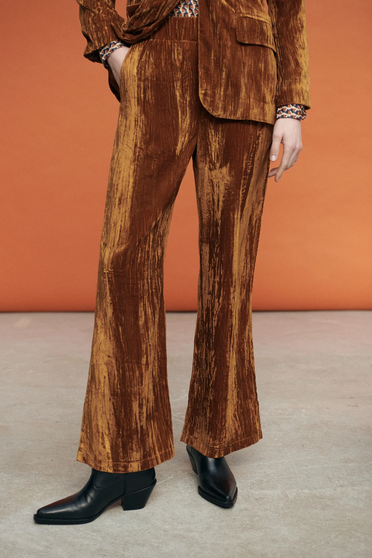 Pantalón de terciopelo Tjaša TT74 en tonos azul, marrón y cobre. Cintura elástica con goma, corte ligero de estilo acampanado. Sofisticado y cómodo.