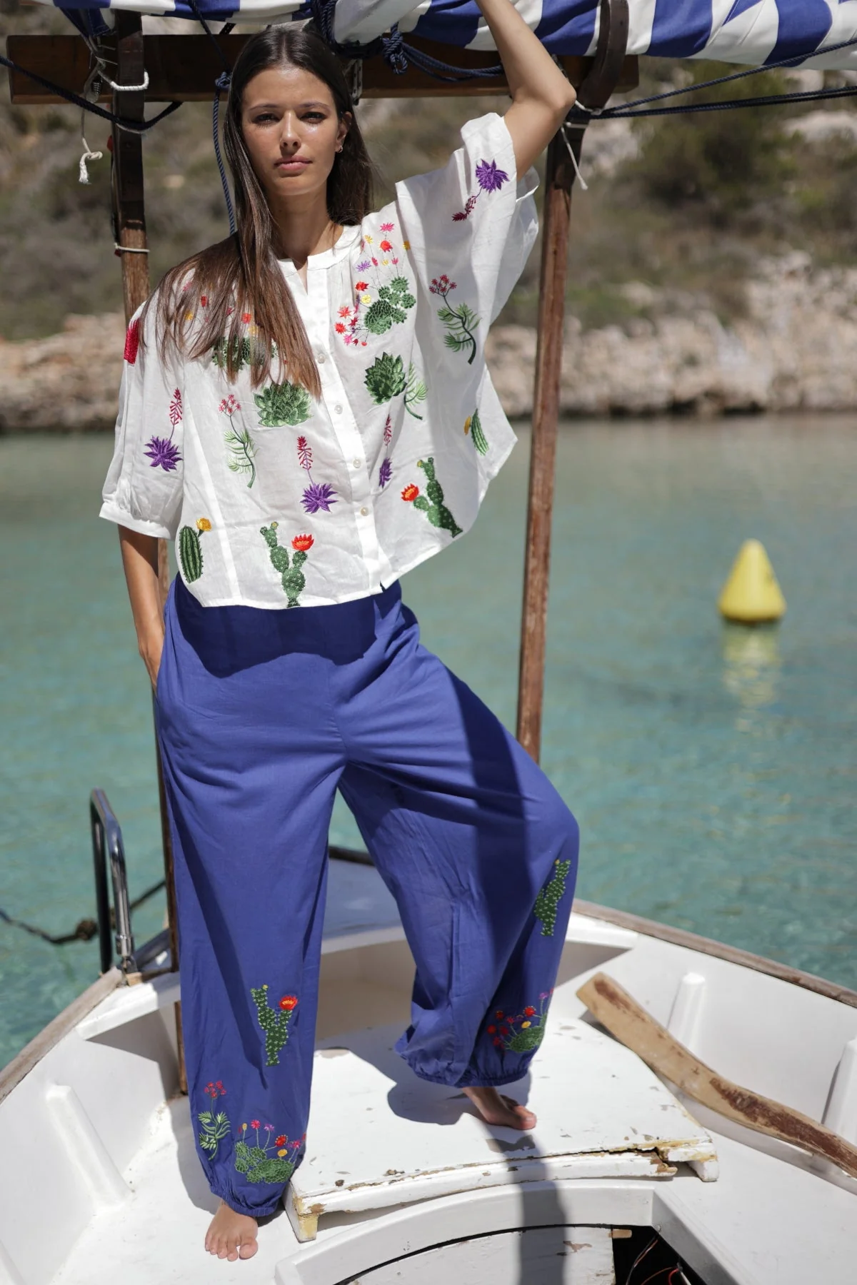 Pantalón Theodora en color azul con bordados de cactus. Es la combinación perfecta de comodidad y estilo. Con un corte holgado, brinda frescura y libertad de movimiento. Lleva bolsillos y goma en la parte posterior de la cintura. Su diseño boho chic se realza con un delicado fruncido en el tobillo. que aporta un toque estiloso y original. Los bordados artesanales tienen un gran protagonismo y pone de manifiesto el trabajo artesanal de esta prenda. El pantalón Theodora es la opción ideal para un look sofisticado!