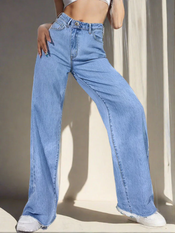 La cintura alta y simétrica de estos pantalones de mezclilla acentúa la silueta, ofreciendo un ajuste favorecedor y estilizado. El acabado ligeramente desgastado añade un toque urbano y moderno, reflejando las últimas tendencias de moda y el estilo único de la moda femenina.