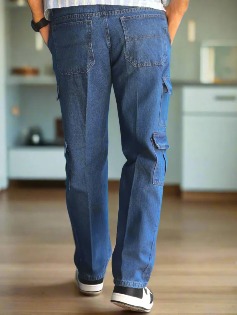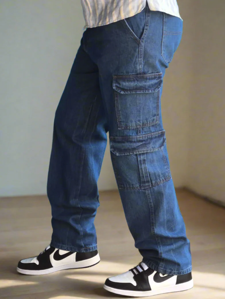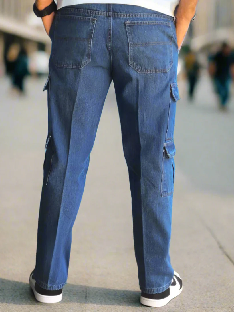 Diseño Funcional y Elegante Nuestros pantalones cargo azul oscuro combinan diseño funcional con elegancia. Los bolsillos amplios y la robusta construcción de denim te ofrecen practicidad sin comprometer el estilo. Ideales para el hombre que valora tanto la apariencia como la funcionalidad, estos pantalones son una adición esencial a tu guardarropa.