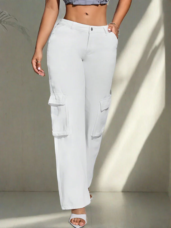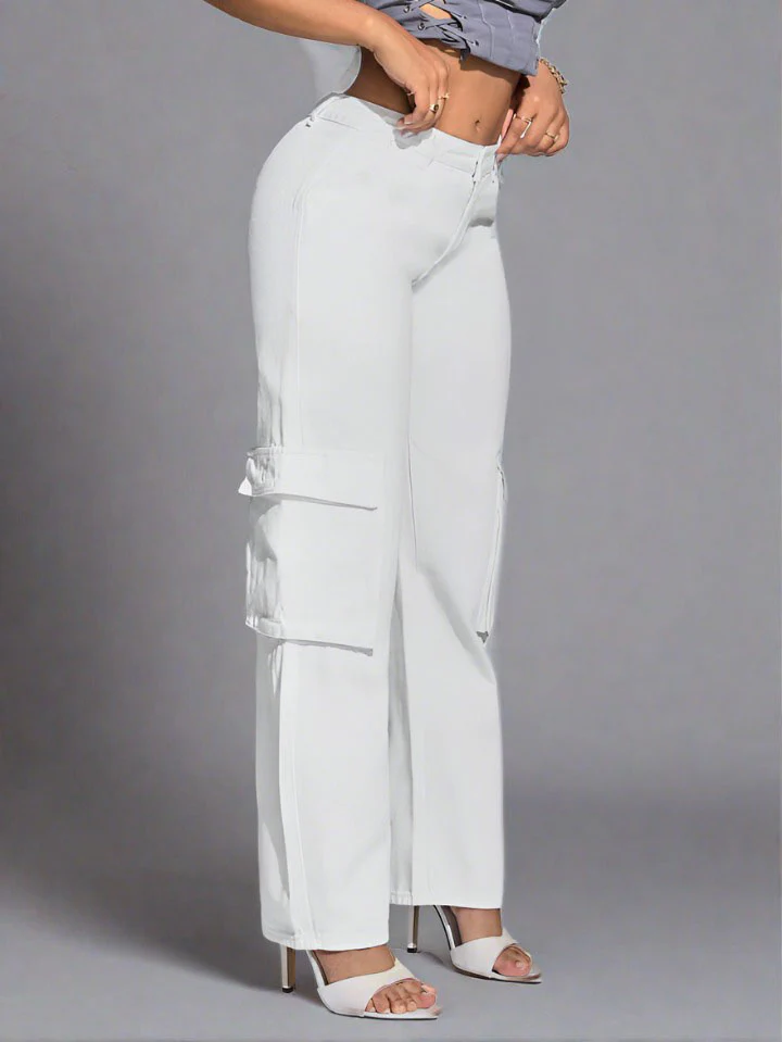 Los bolsillos cargo en estos jeans blancos combinan conveniencia y estilo. Ofrecen funcionalidad sin sacrificar la elegancia, haciéndolos ideales para la mujer que busca practicidad en su moda diaria. Estos pantalones son un must-have para un estilo casual y chic.