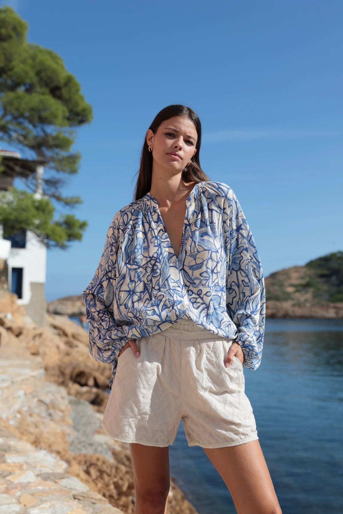 Short Lupita . Confeccionado en algodón fresco y ligero en color beige con bordados en relieve a tono. Su bordado le añade un toque elegante y sofisticado . Detalle de delicada pasamanería artesanal a tono en cintura y con hilo dorado a contraste en la parte inferior. Cintura elástica en la parte posterior para adaptarse perfectamente a tu silueta. Con bolsillos. Lleva forro. Sigue tu talla habitual . El short Lupita es una prenda versátil que combina a la perfección con el chaleco Myriam para un estilo más tranquilo o con la blusa Joanne para un look estiloso y super chic!