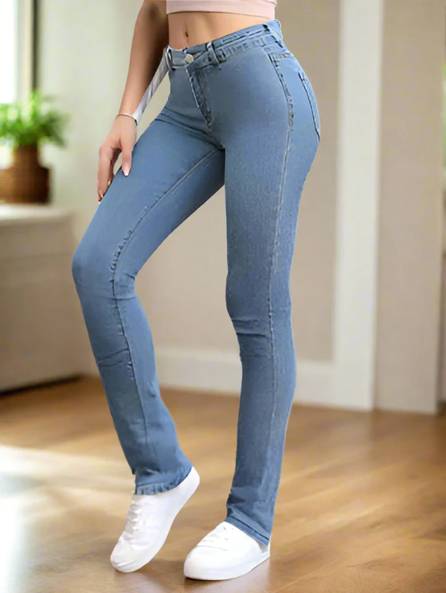 Descubre los jeans ajustados con un twist motero en PantalonesDeMezclilla.MX. Estos pantalones, con lavado claro y costuras únicas, son perfect
