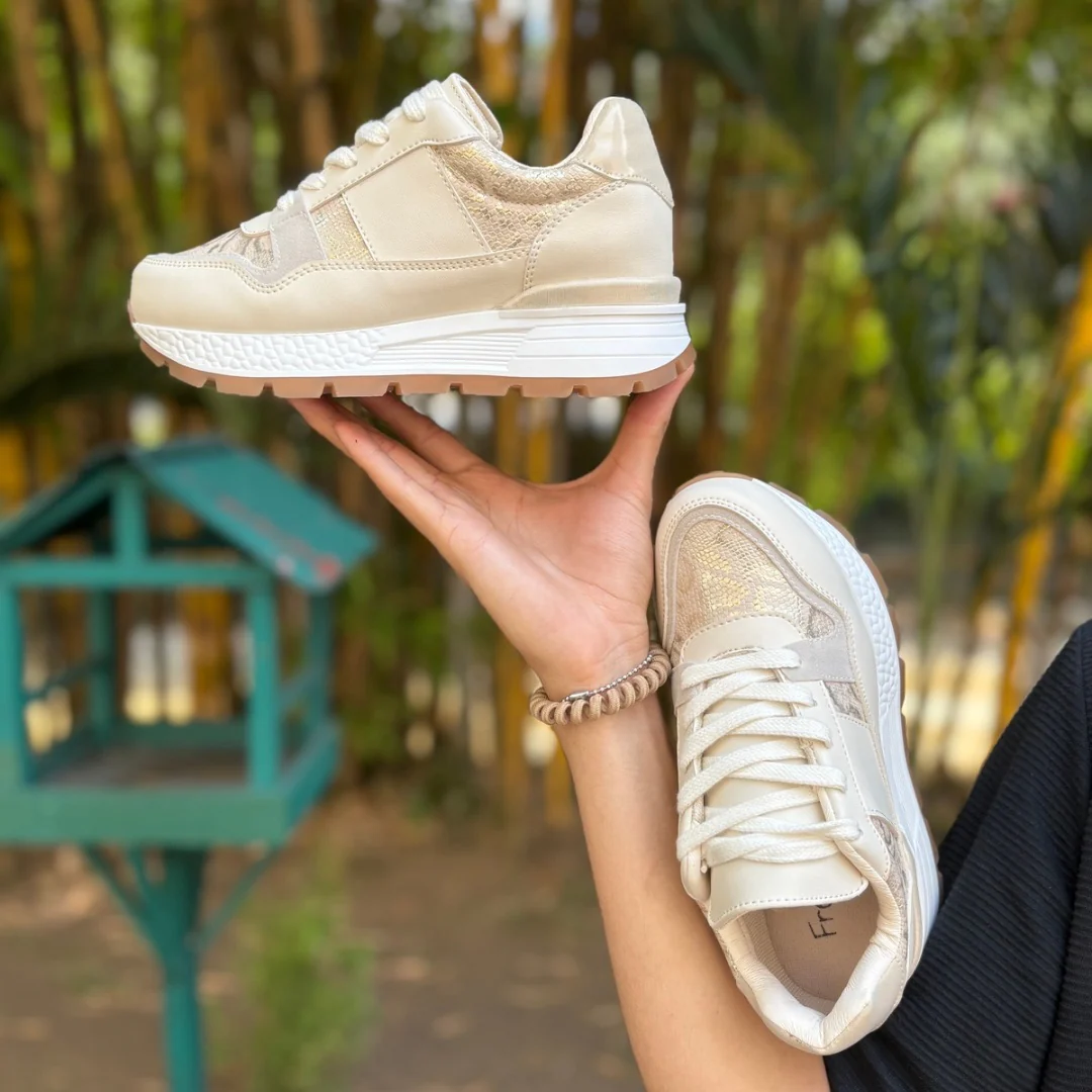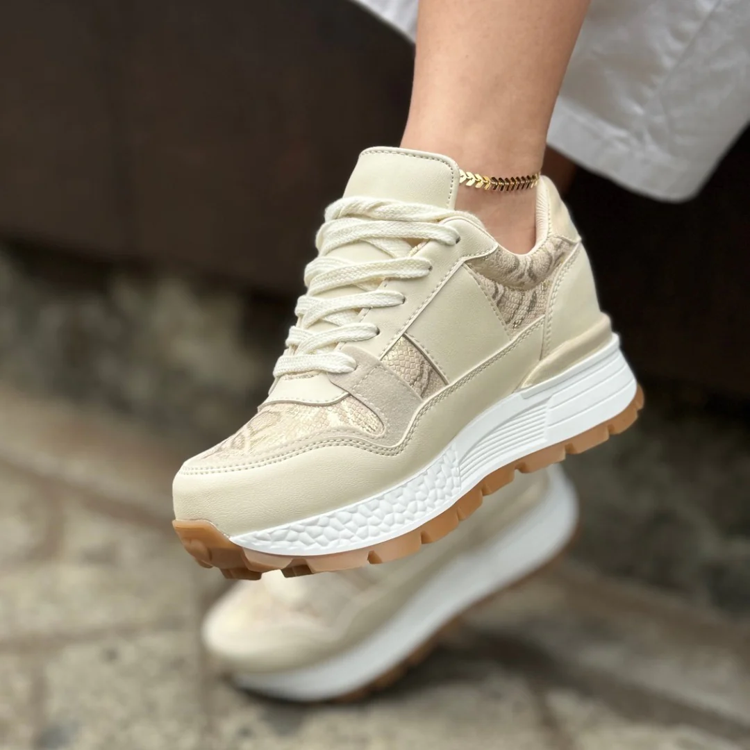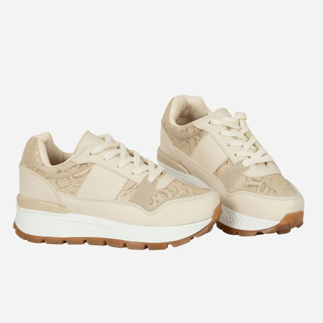 Los Tenis BEIGE ANIMAL elevan cualquier look gracias a su elegante combinación de tonos neutros con detalles en animal print dorado que aportan un brillo sutil y sofisticado.