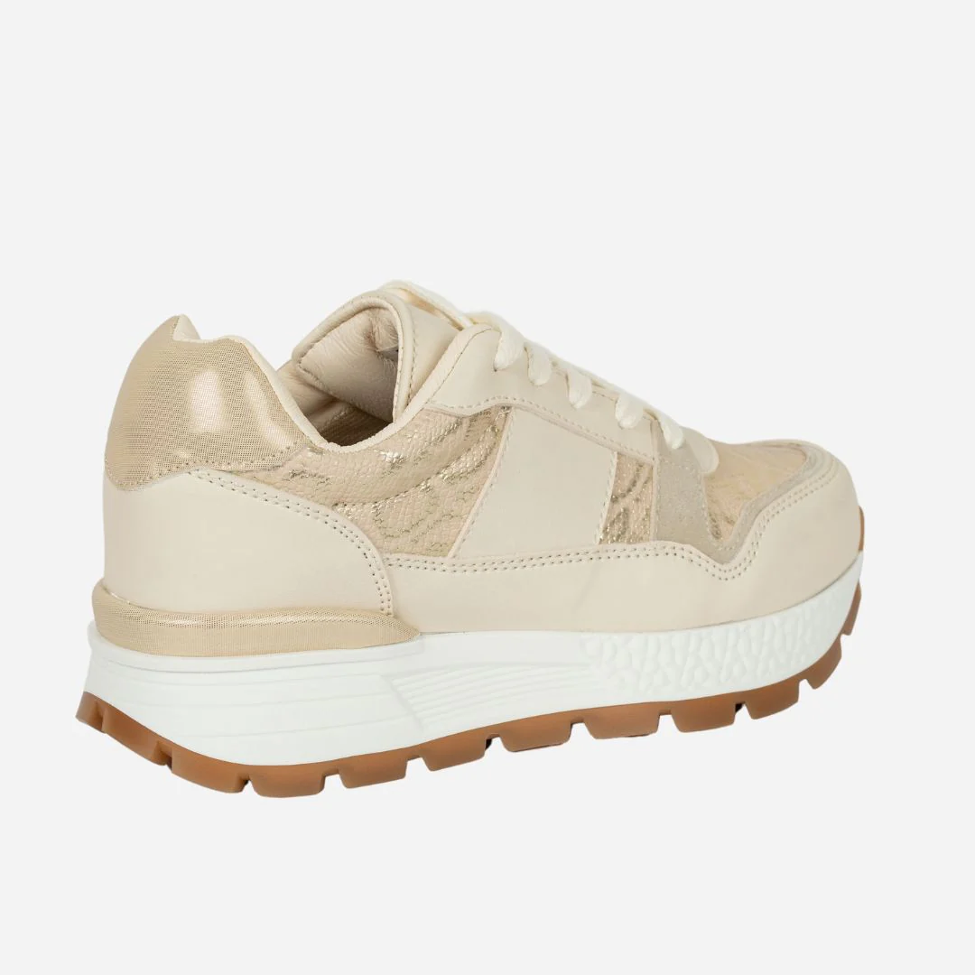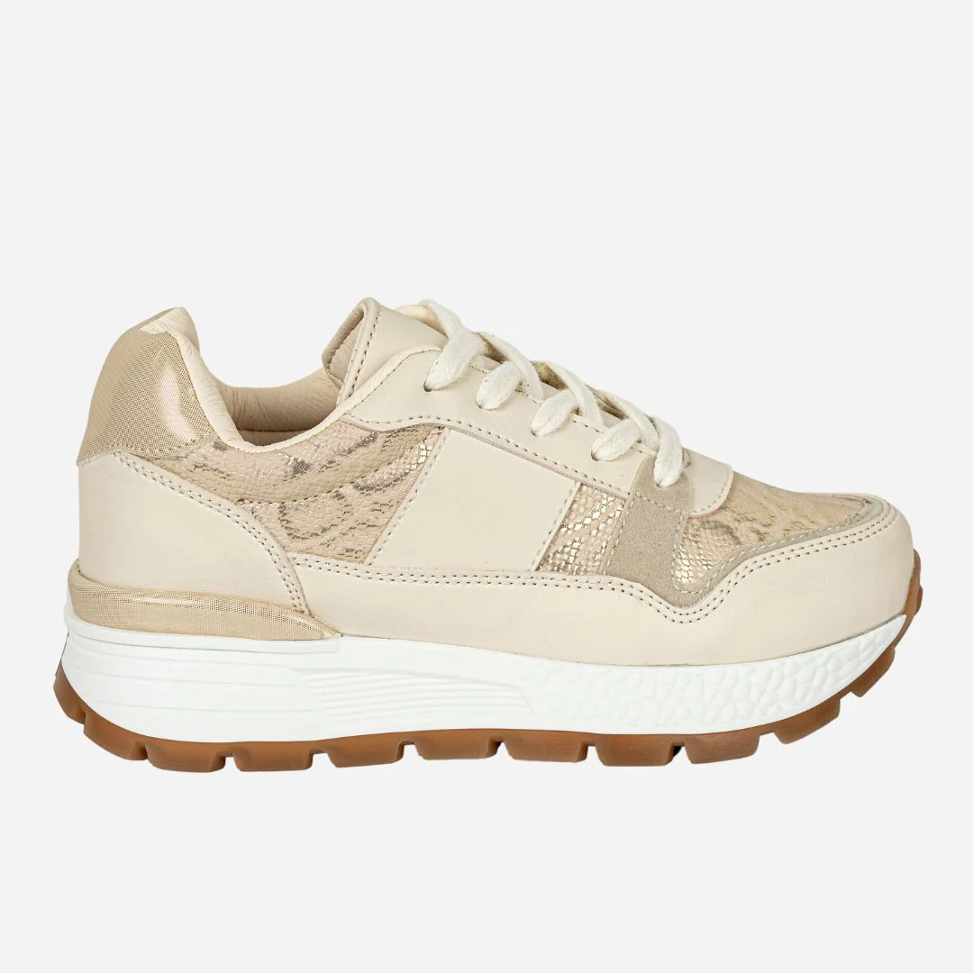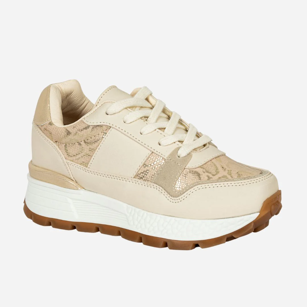 Los Tenis BEIGE ANIMAL elevan cualquier look gracias a su elegante combinación de tonos neutros con detalles en animal print dorado que aportan un brillo sutil y sofisticado.