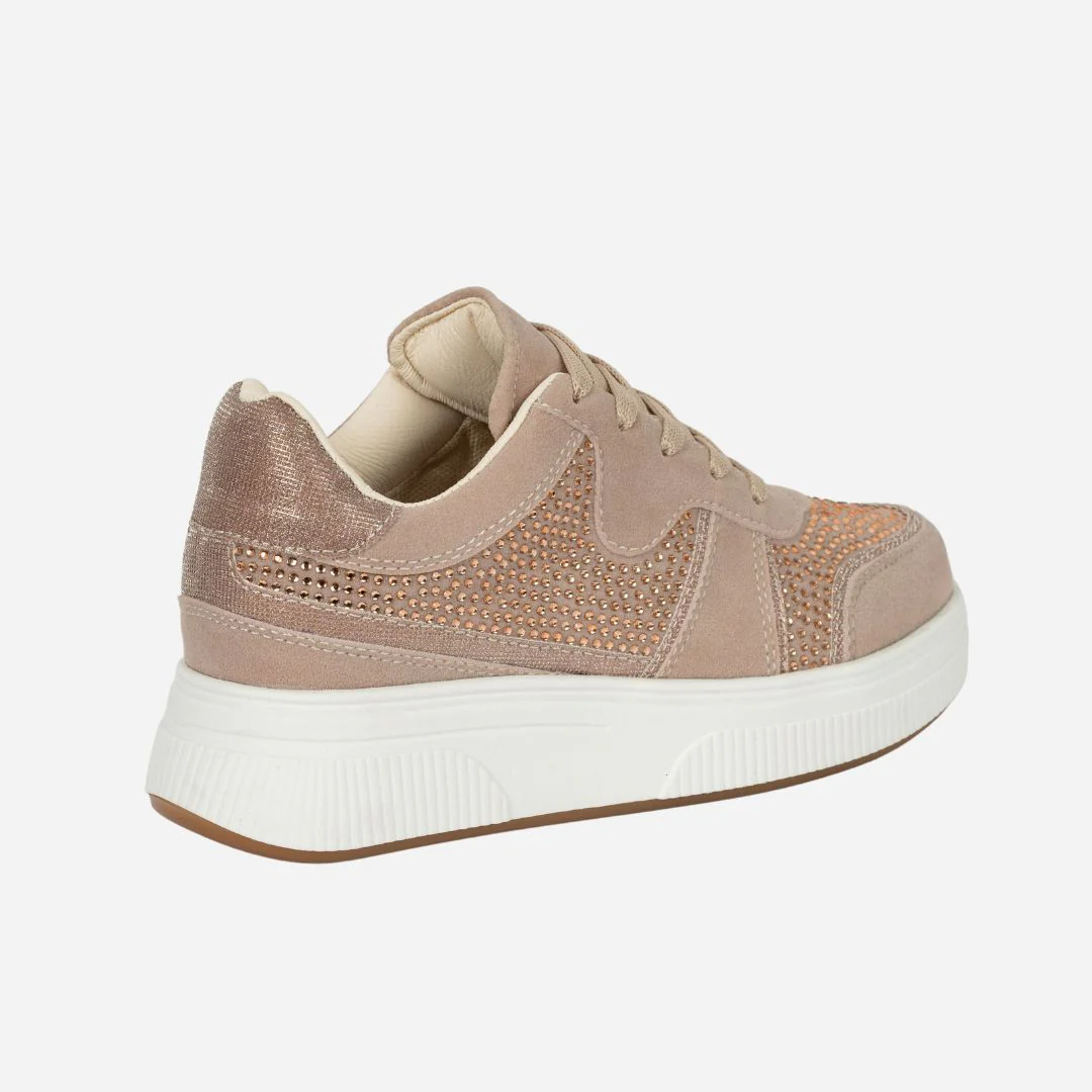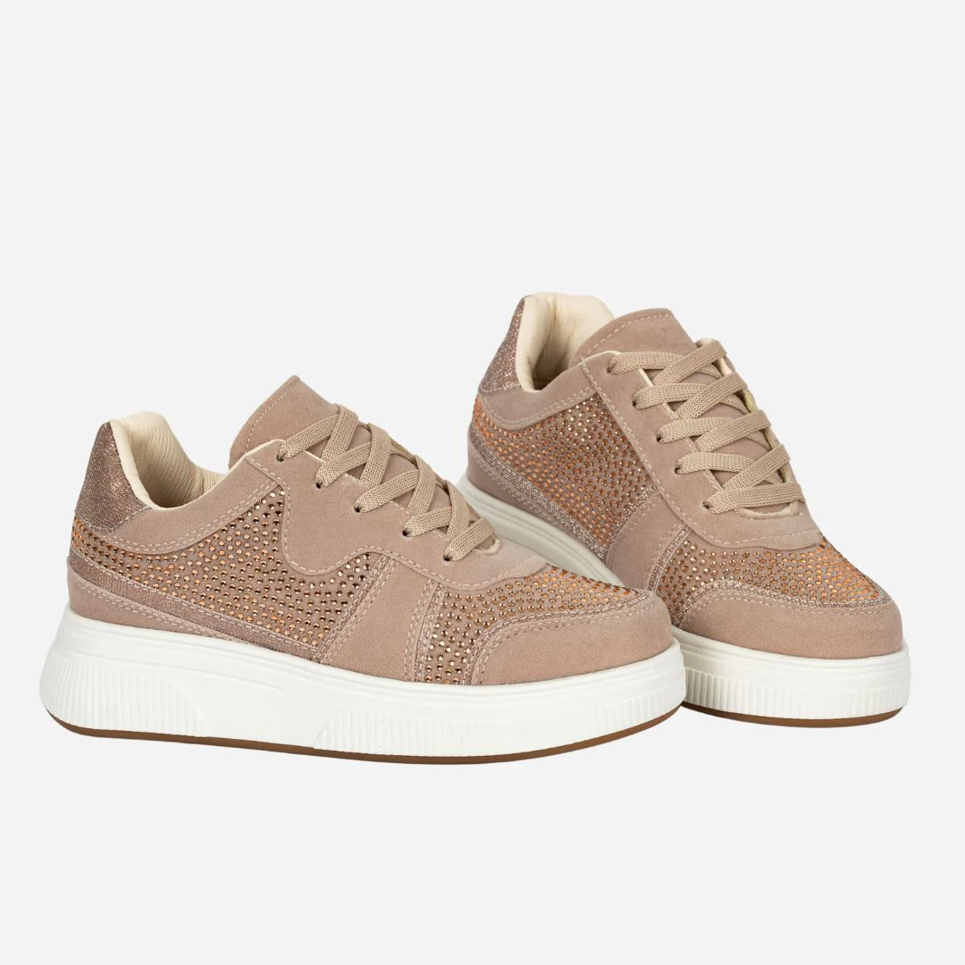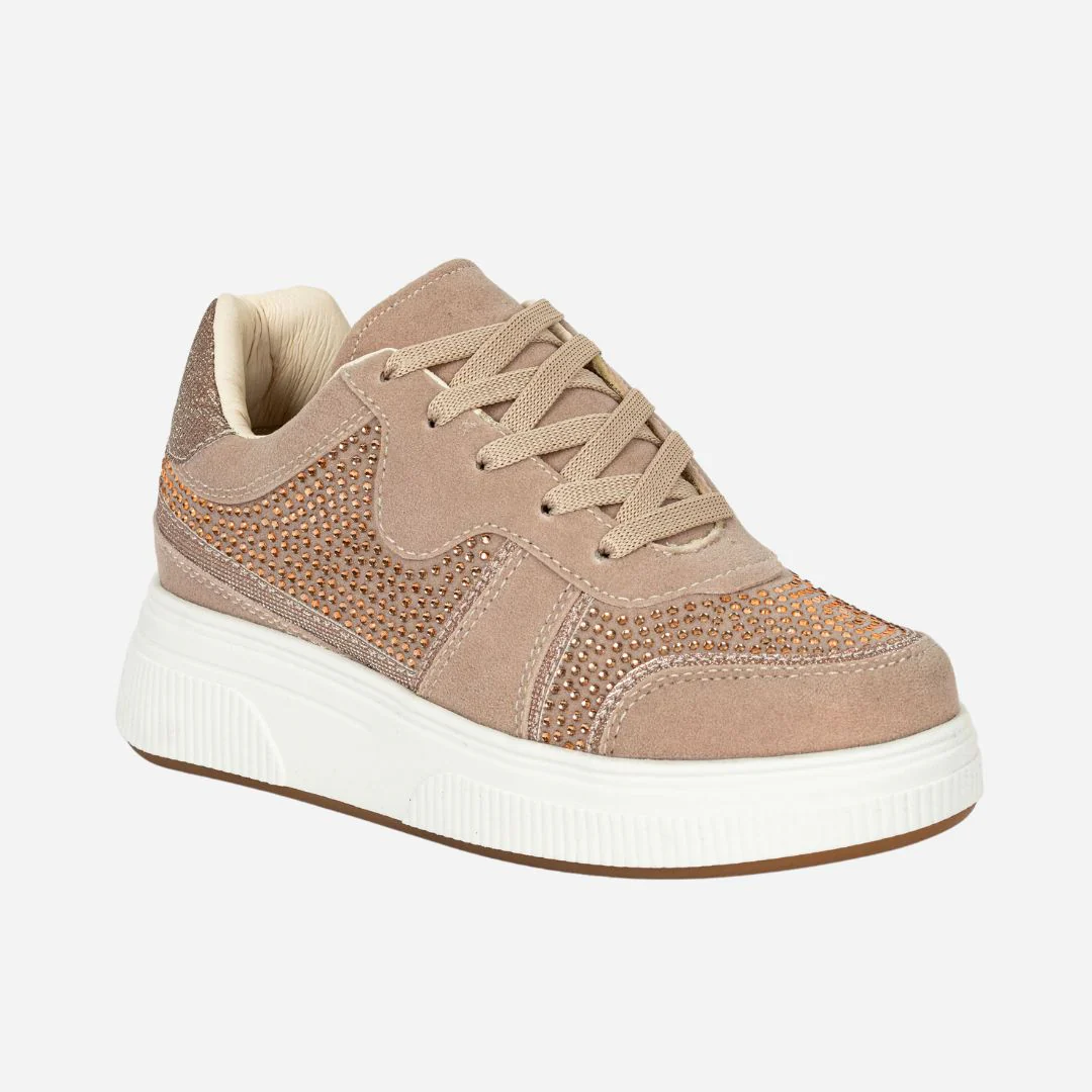 Este diseño en tono palo rosa con apliques brillantes es perfecto para mujeres que aman lo delicado pero no pasan desapercibidas. Su tono neutro te da versatilidad para combinar con jeans, faldas o conjuntos monocromáticos, mientras que su diseño elegante con brillo sutil aporta un toque de lujo a tu día a día.
