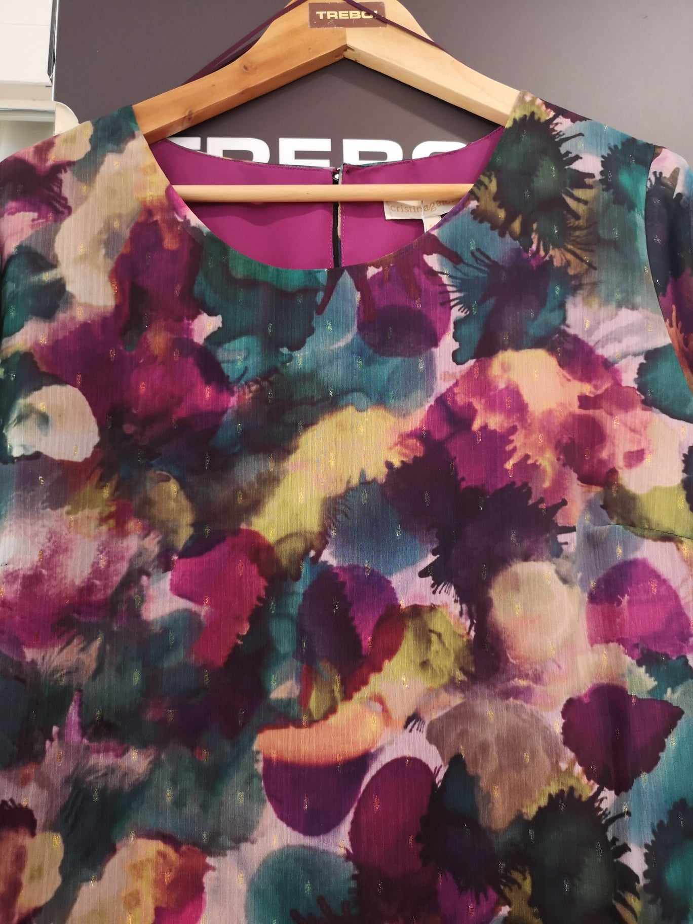 El top estampado de manga larga y rematado con plumas (se pueden desmontar) está confeccionado en tejido de gasa (100% poliéster) y forrado para evitar transparencias.