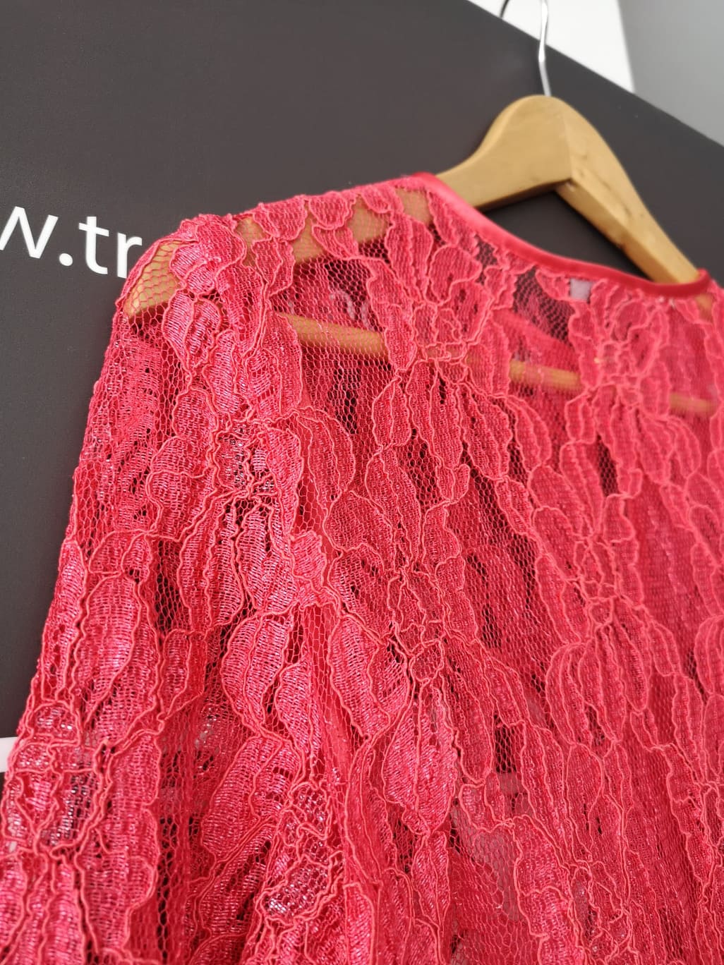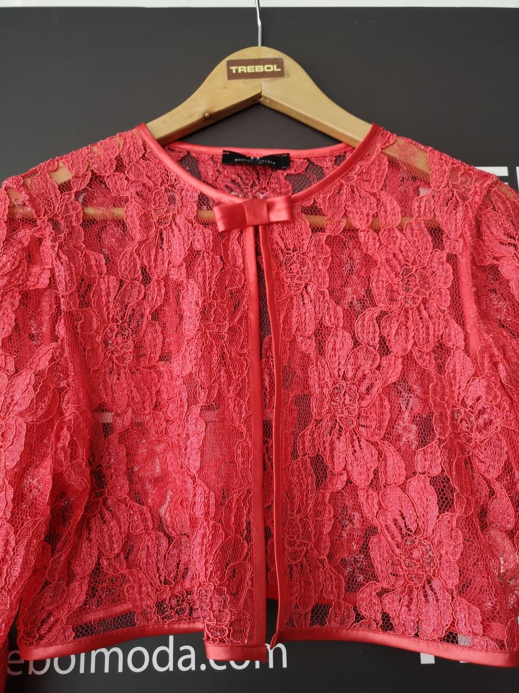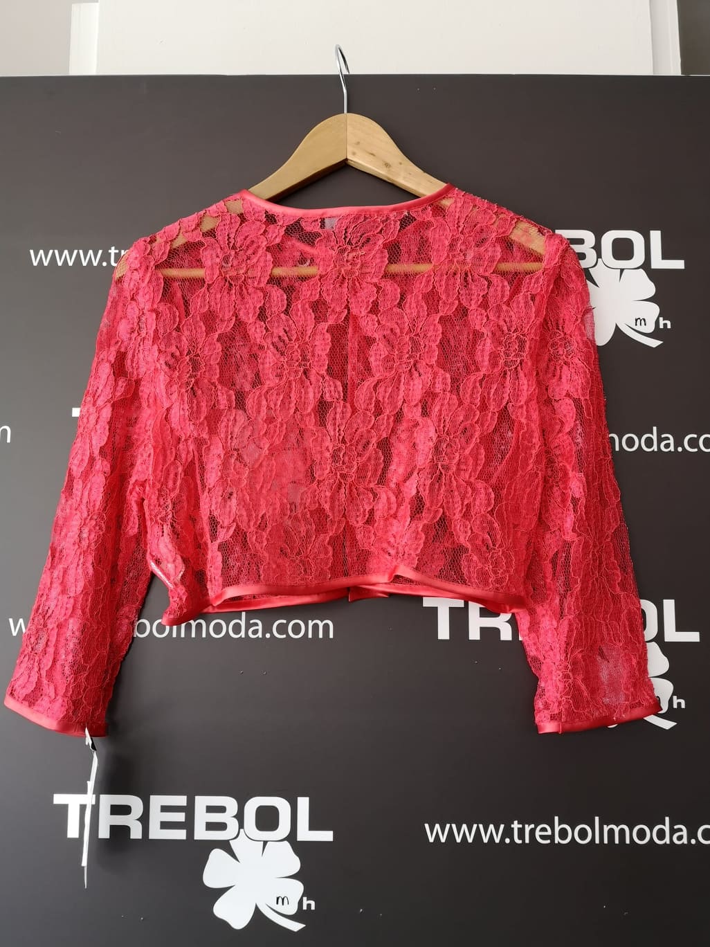 Torera de encaje con mangas 3/4. Cerrada con un lazo en el escote delantero.