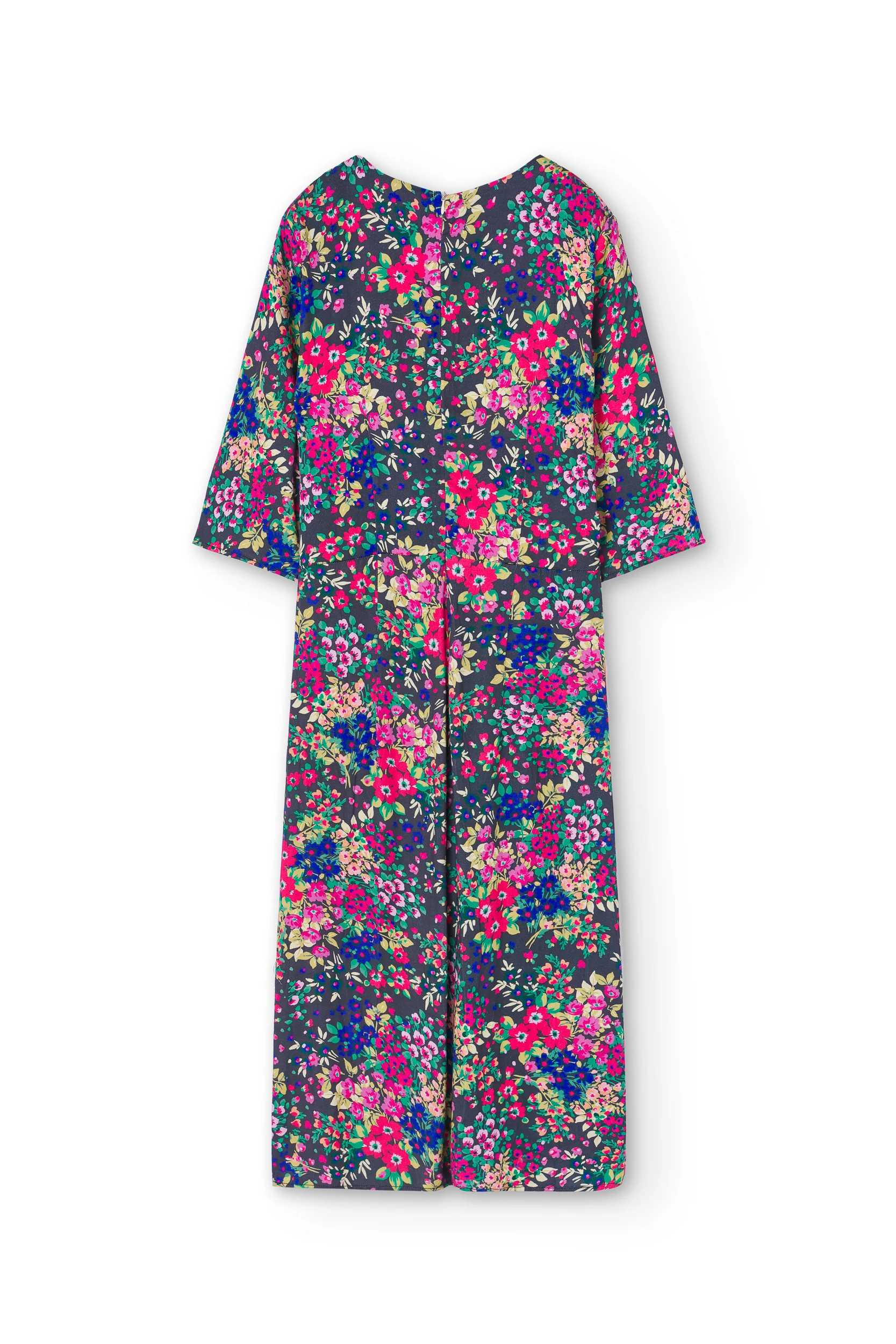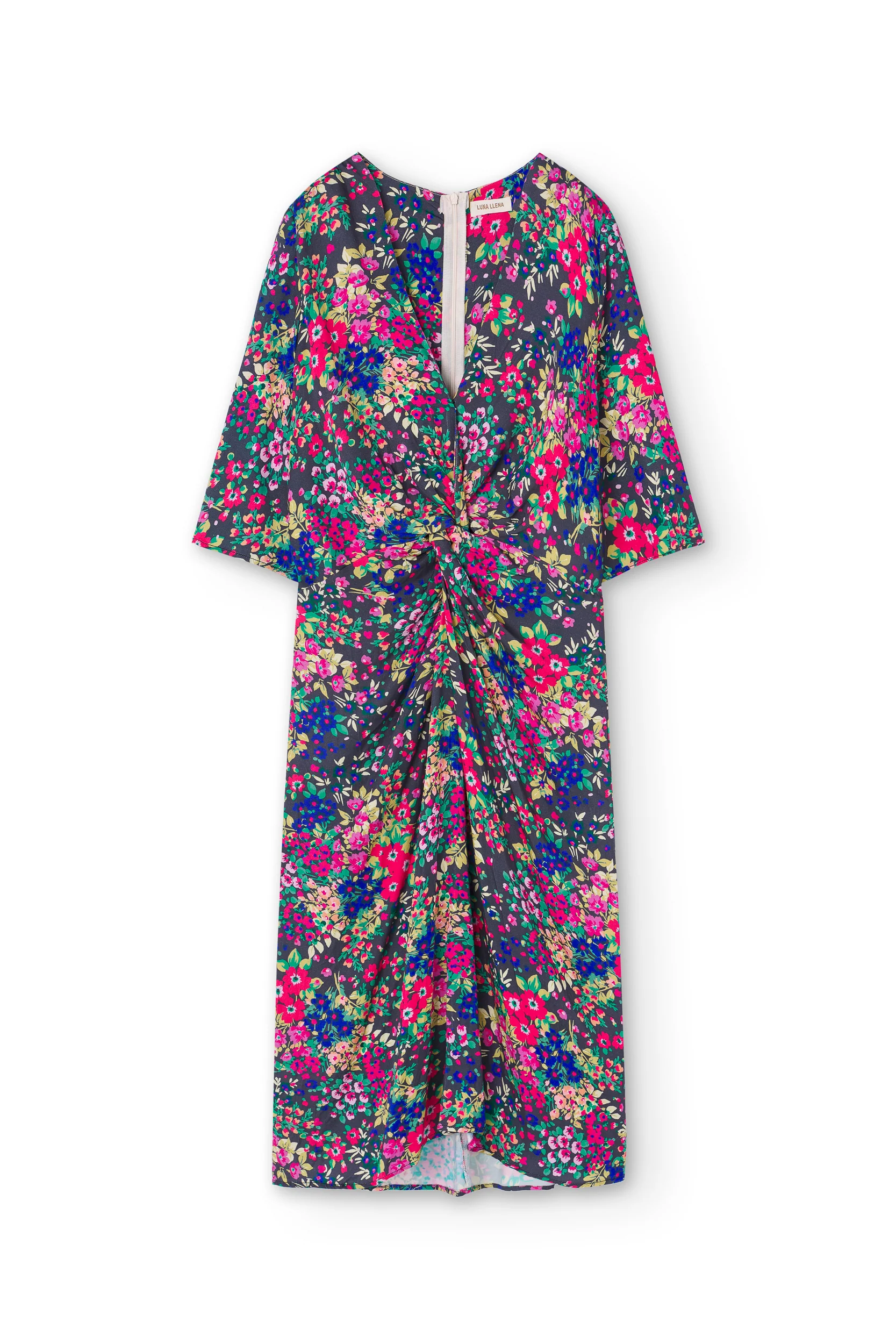 Vestido Amelie. Muy femenino. Estampado florecitas en tonos azul y fucsia. Con corte midi. Favorecedor escote en V. Manga 3/4. Con nudo drapeado en la parte de delante. Sigue tut talla habitual.