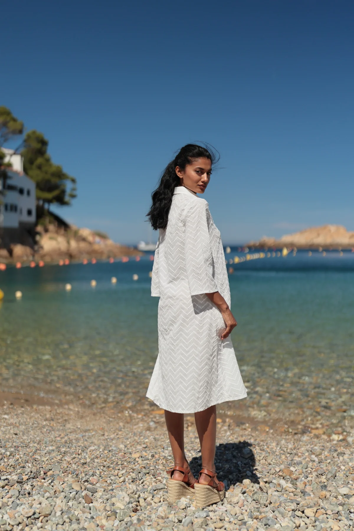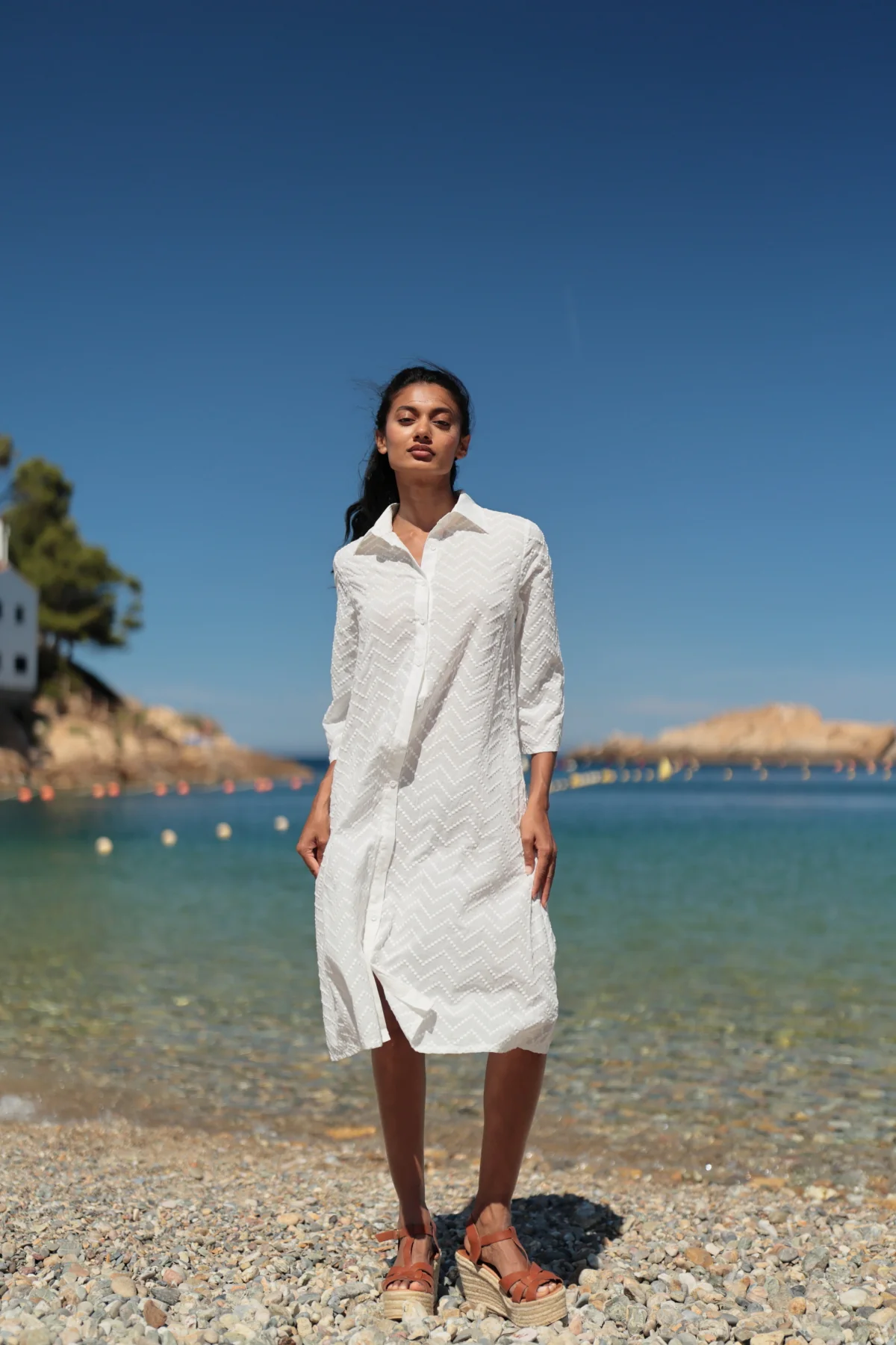 Vestido camisero Miami. En elegante color blanco con bordados en relieve a tono. Su material fluido aporta una textura delicada y fresca para los dias calurosos. Su diseño presenta una silueta relajada con cuello camisero. Manga 3/4. Su apertura frontal con botones lo convierte en una prenda versátil y fácil de llevar. Sigue tu talla habitual. Esta prenda es una elección encantadora par disfrutar del verano con estilo y comodidad. Es ideal para un look casual chic combinando ligereza y estilo .