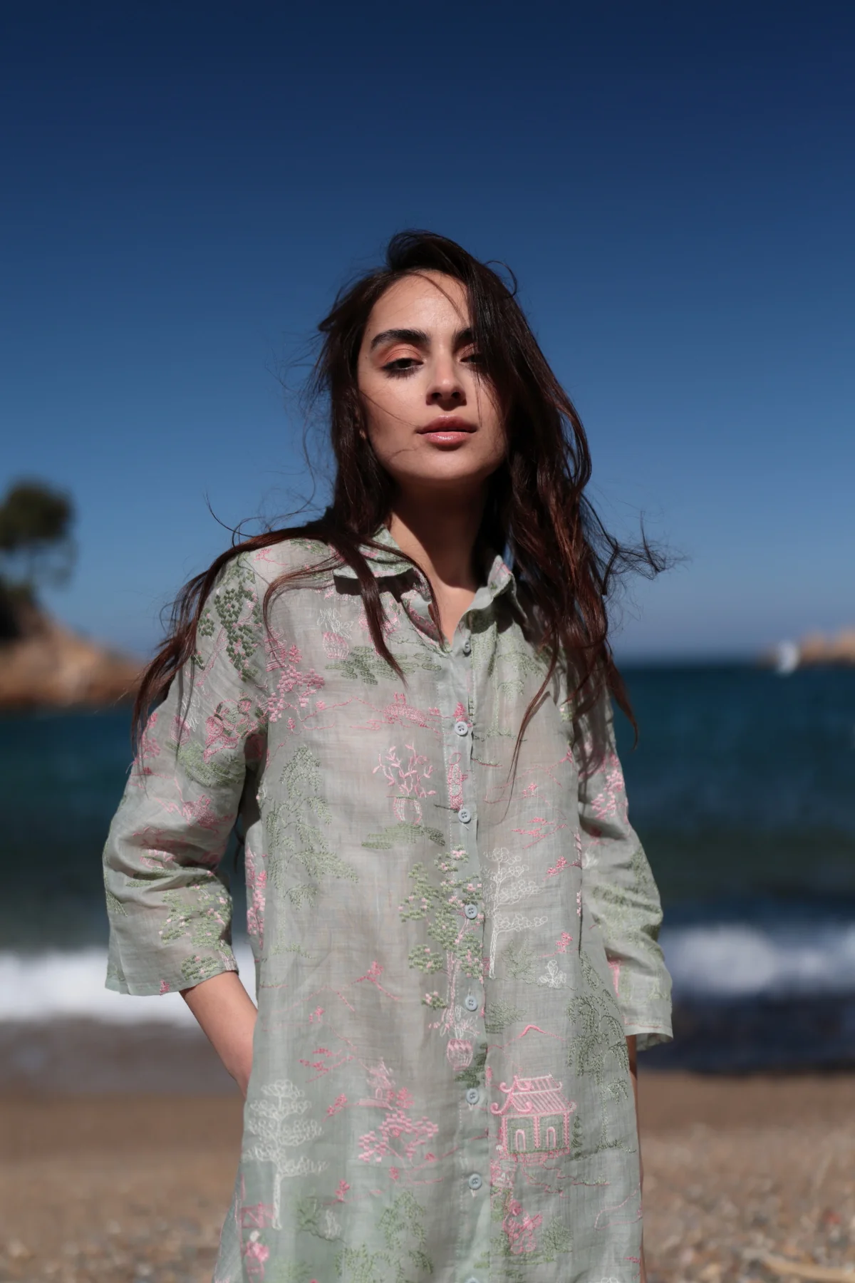 Vestido camisero Miami. En color aqua con delicado bordado a contraste. Su material natural aporta una textura delicada y fresca para los dias calurosos. Corte fluido. Su diseño presenta una silueta relajada con cuello camisero. Manga 3/4. Su apertura frontal con botones lo convierte en una prenda versátil y fácil de llevar. Sigue tu talla habitual. Esta prenda es una elección encantadora par disfrutar del verano con estilo y comodidad. Es ideal para un look casual chic combinando ligereza y estilo .