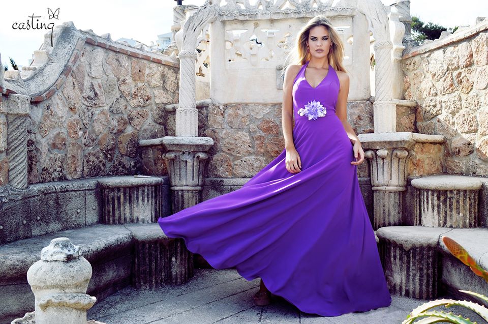 Vestido largo con escote pico y espalda descubierta. Cerrado con cremallera invisible. Confeccionado en crep (100% poliester). Incluye broche de flores (desmontable).