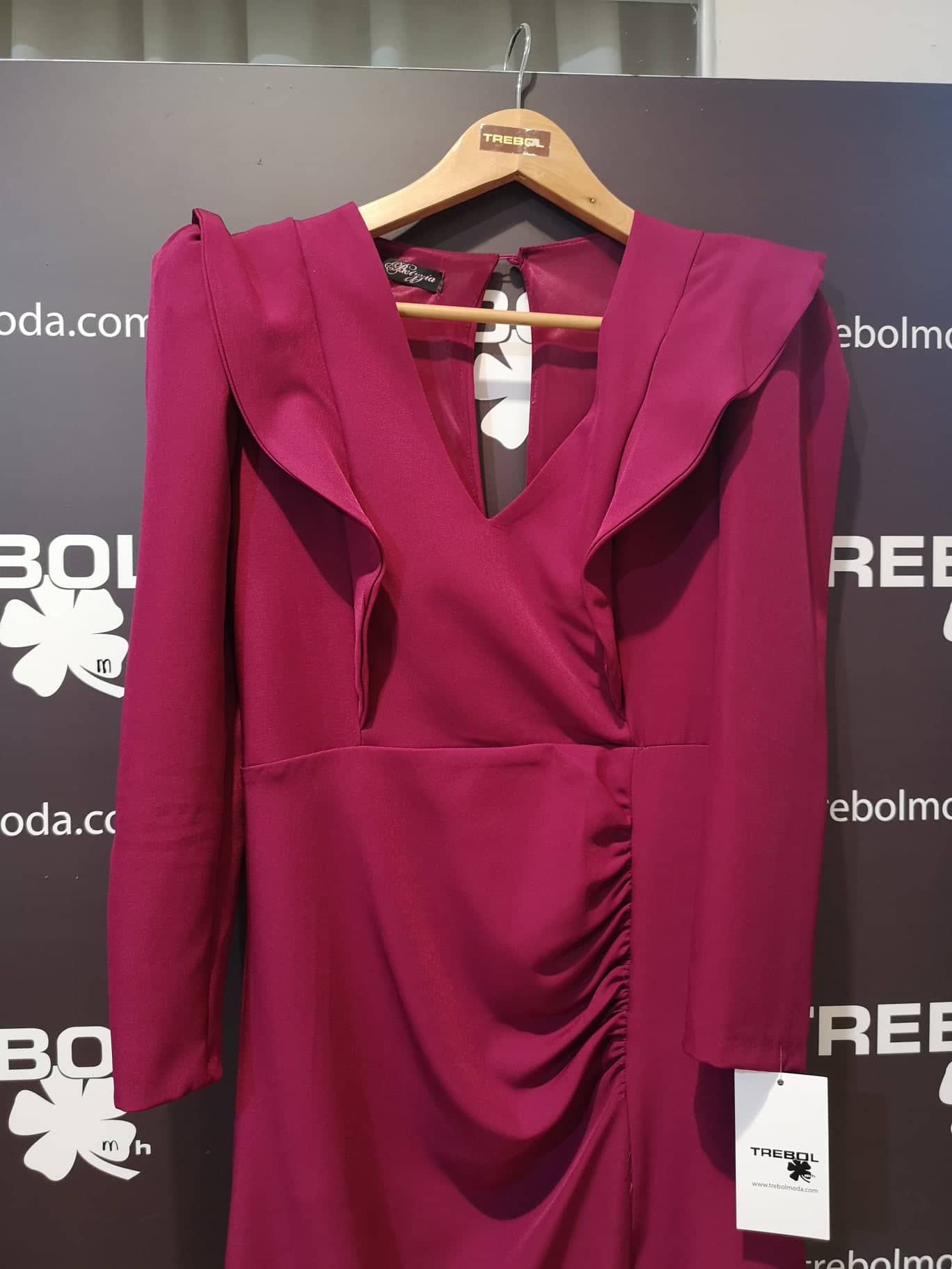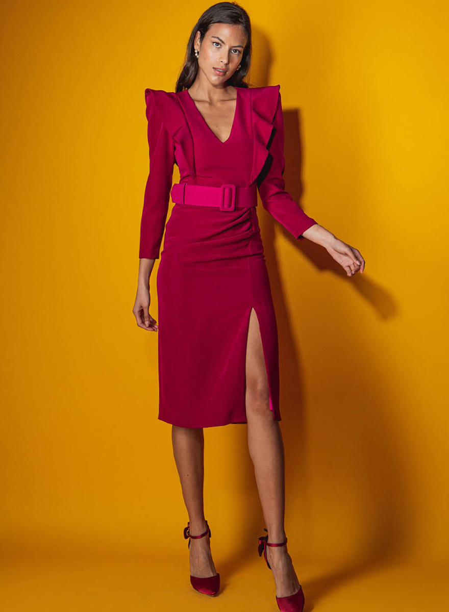 Vestido midi con drapeados en cintura, mangas con hombreras y falda con abertura en pierna izquierda.