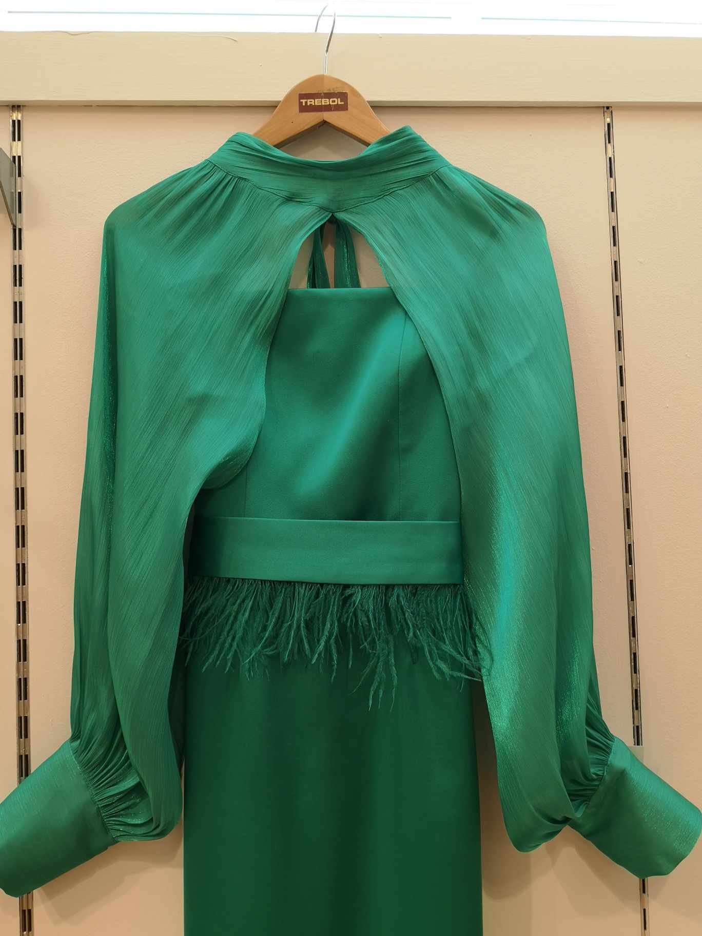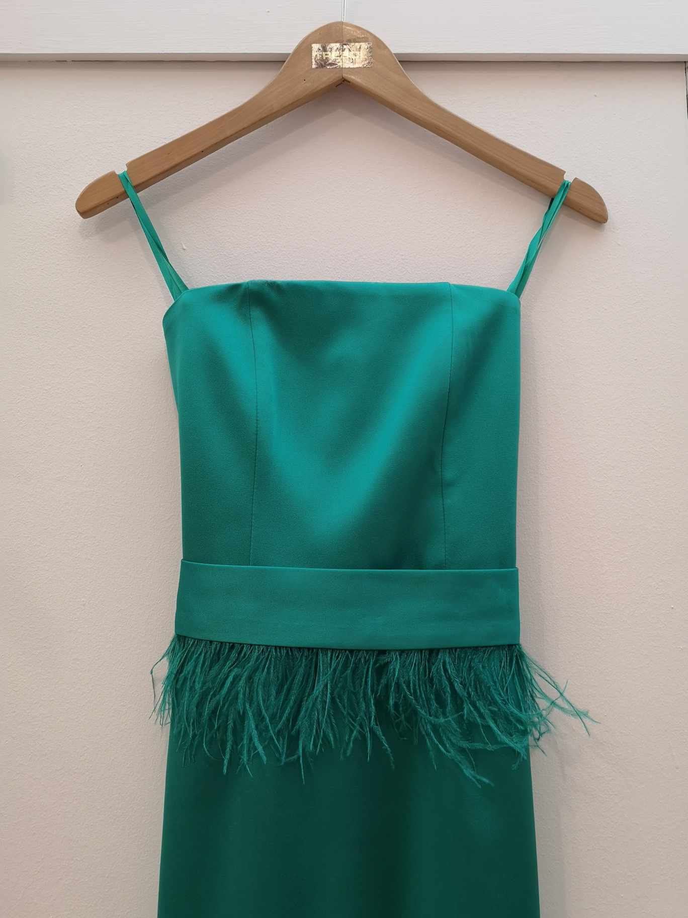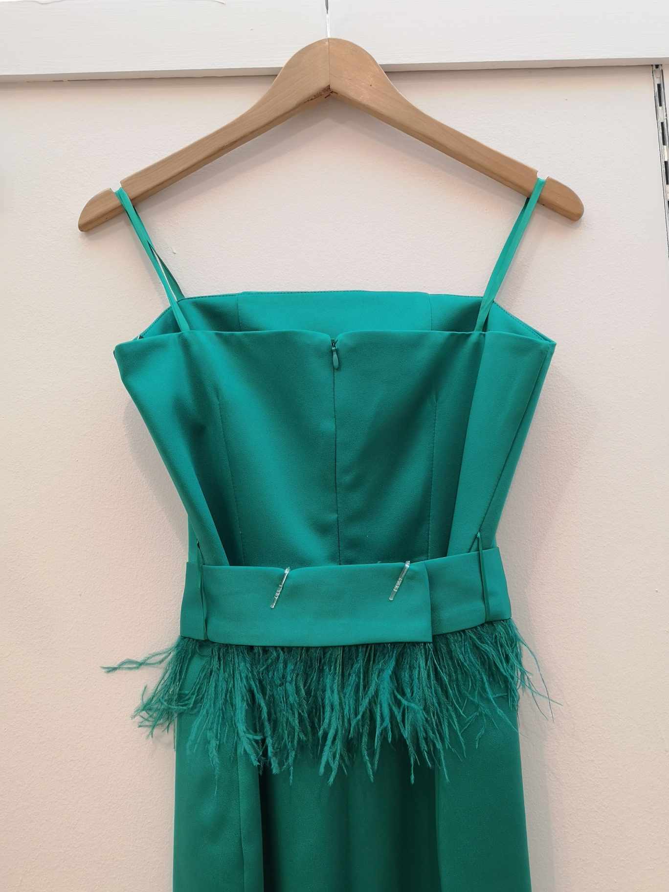 Vestido recto con escote palabra de honor y cinturón de plumas (incluido). Confeccionado en tejido bielástico.