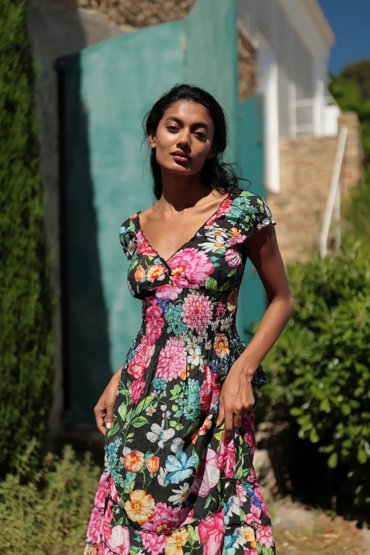 Vestido flores Frida . Manga corta abullonada con fruncido. Cintura elástica que se ajusta perfectamente a tu silueta . Favorecedor escote con fruncido en la parte de delante y posterior. Material natural 100 % Rayon . Su estampado floral le aporta una aire alegre y femenino y sus falda larga de caida suelta acabada en volantes realza su aspecto bohemio. El vestido Frida es ideal para vestir con estilo!