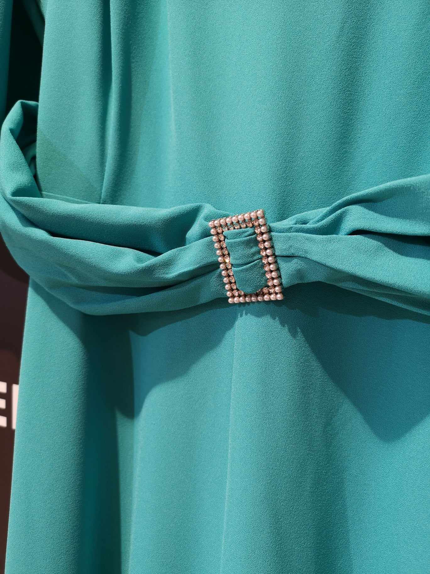 Así como su fajín drapeado en cintura (para disimular barriguita).
