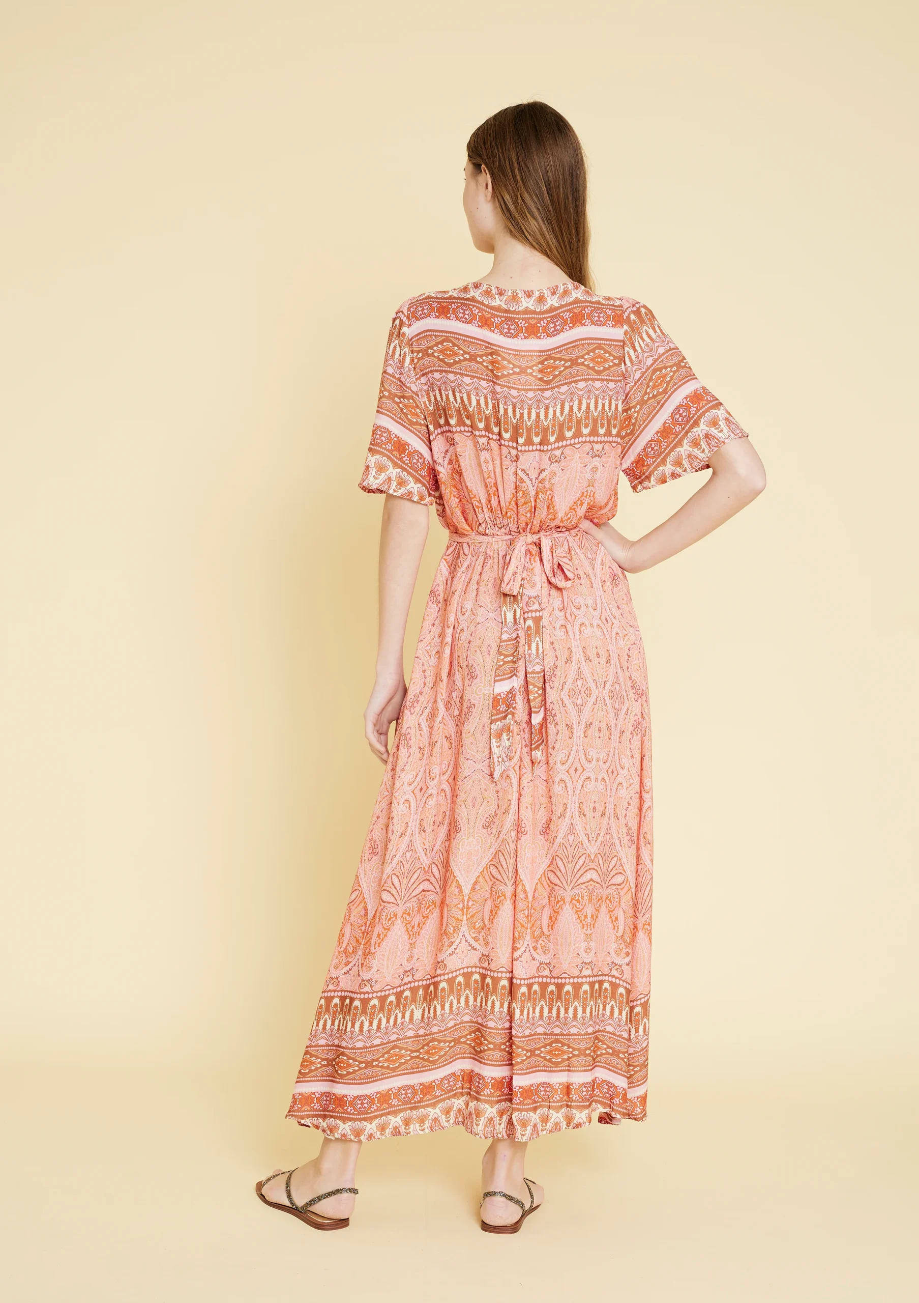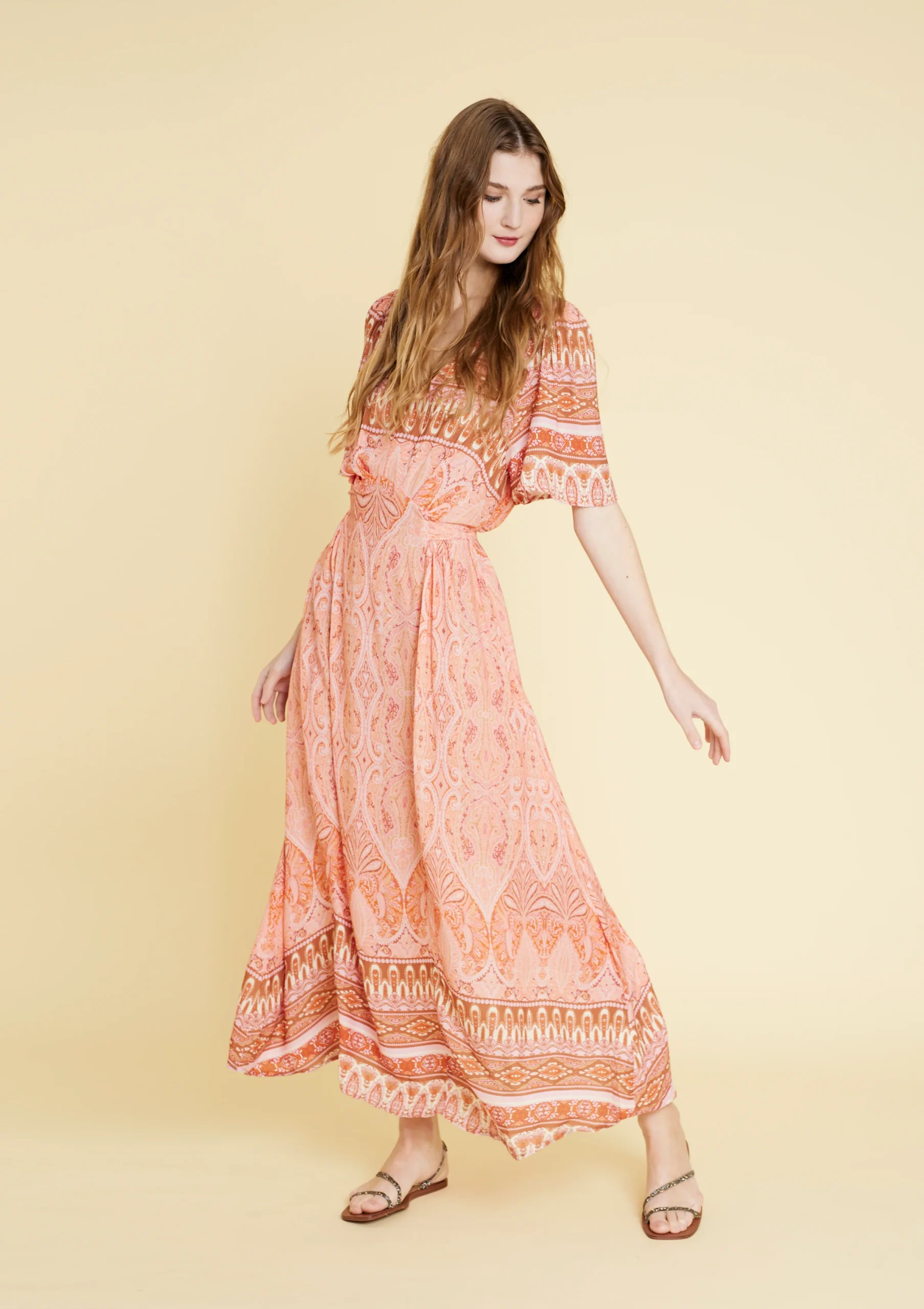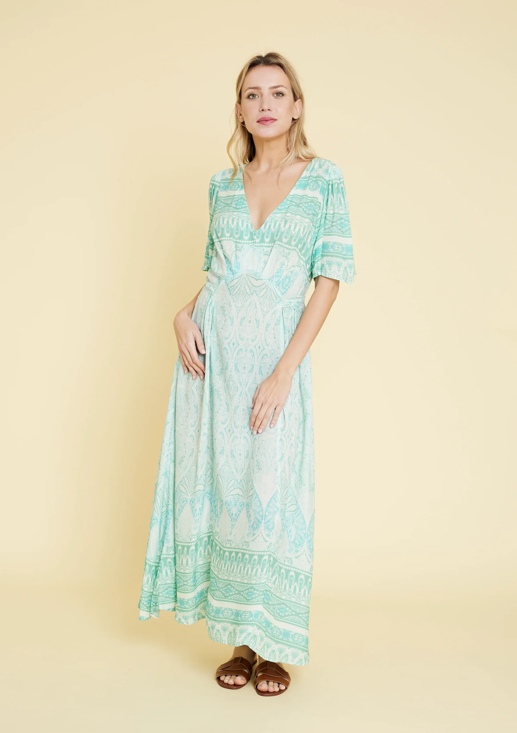 Vestido largo estampado. Manga corta y escote en V. Material 100% rayón. Disponible en color acqua y naranja.