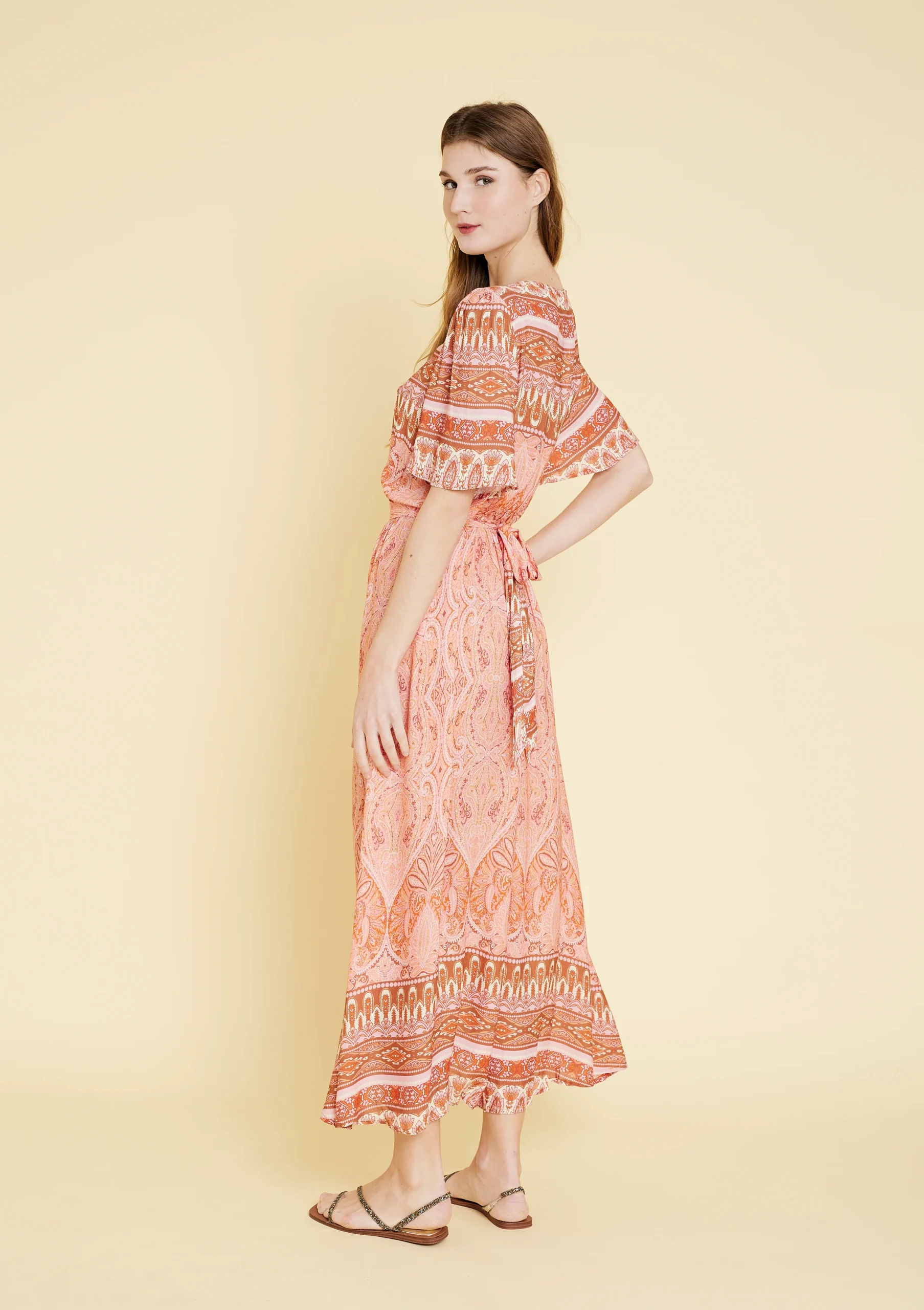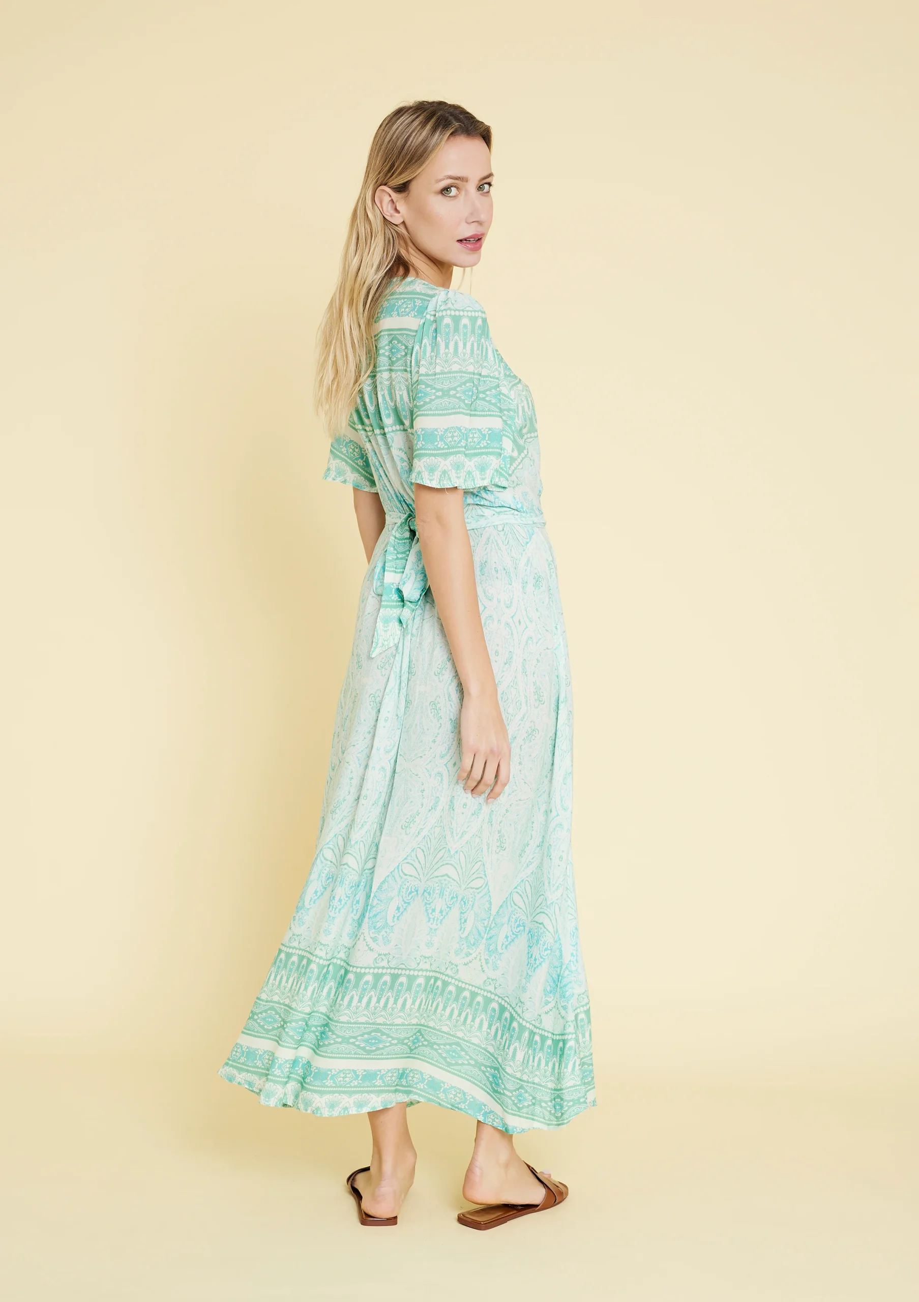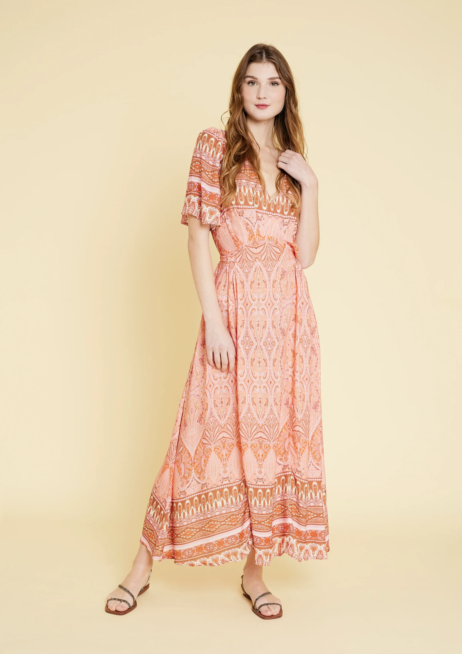 Vestido largo estampado. Manga corta y escote en V. Material 100% rayón. Disponible en color acqua y naranja.