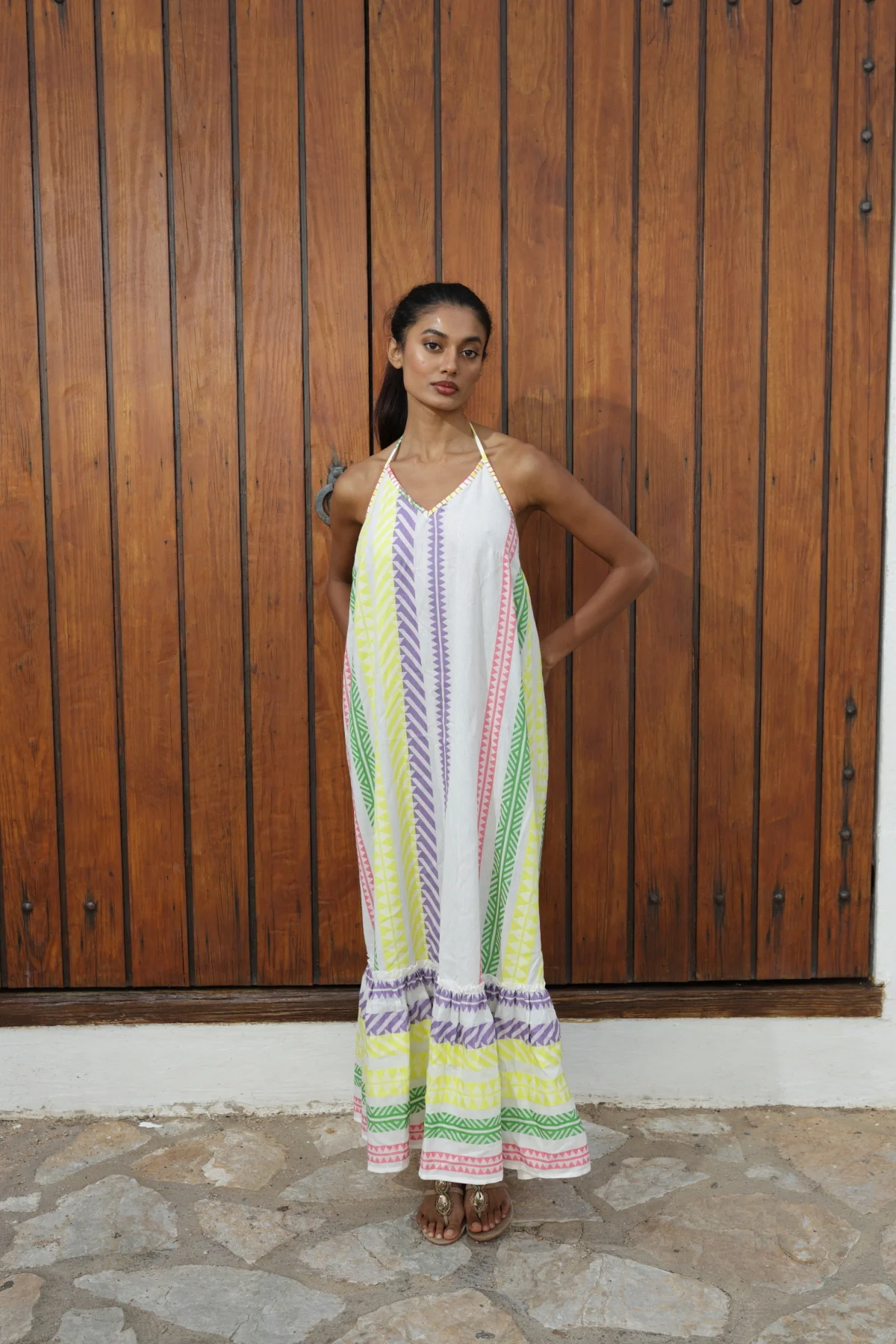 El vestido largo Pauline, tiene un bonito estampado . En algodón. De corte largo, acabado con volante. Con finos tirantes acabados en pompón hecho a mano que te permite anudarlo a tu cuello o llevarlo cruzado. y se prolongan en un sugerente escote en espalda. Regular fit.